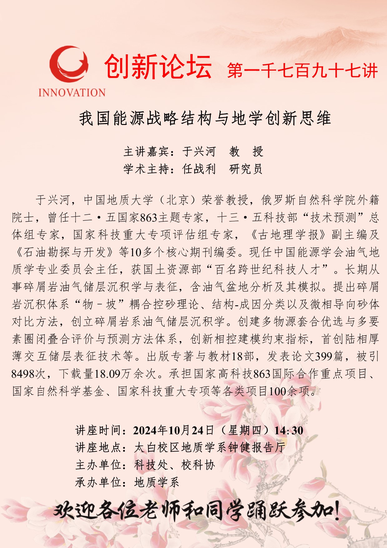 于兴河 教授 bat365正版唯一官网创新论坛第一千七百九十七讲:我国能源战略结构与地学创新思维 讲座时间 2024年10月24日(星期四)14:30 讲座地点 太白校区地质学系钟健报告厅 讲座人介绍 于兴河 教授 讲座内容