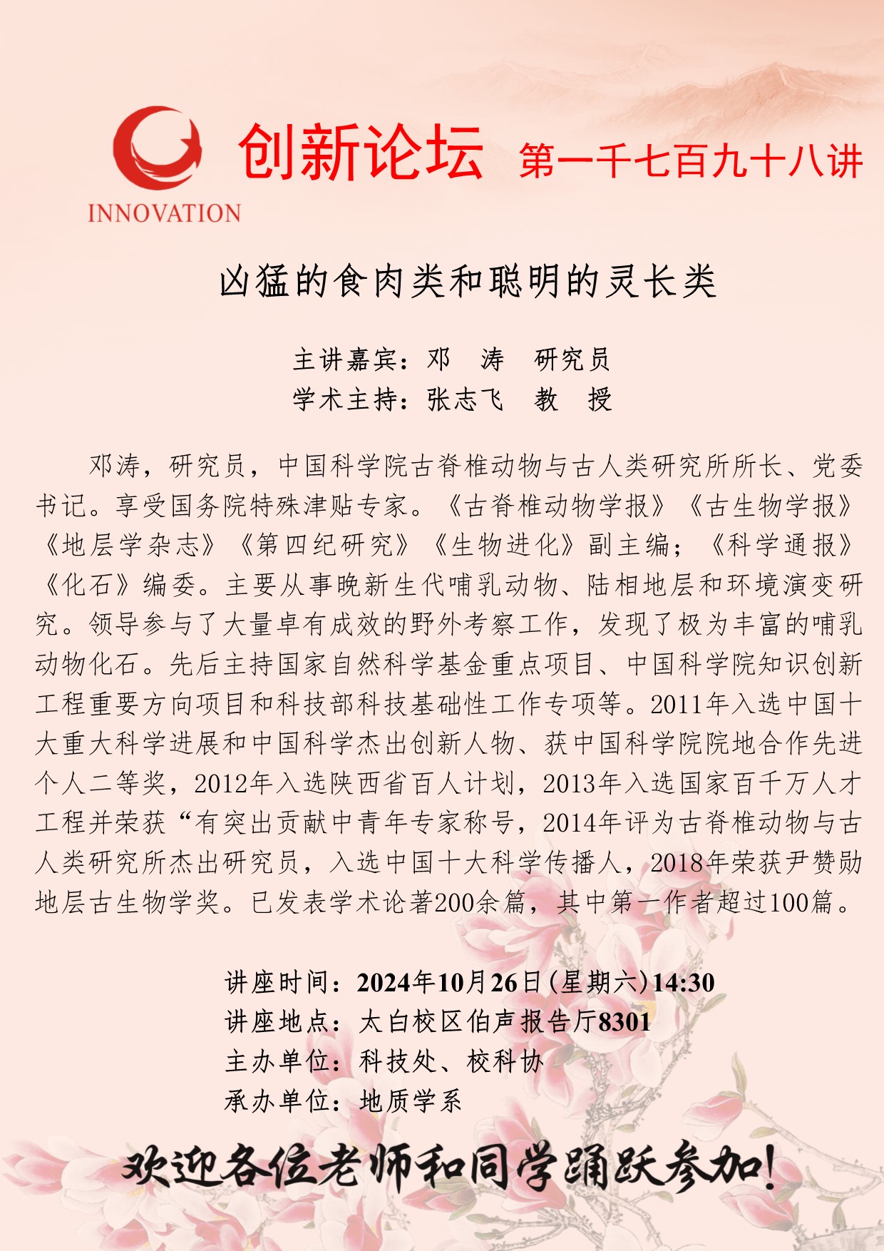 邓涛 研究员 bat365正版唯一官网创新论坛第一千七百九十八讲:凶猛的食肉类和聪明的灵长类 讲座时间 2024年10月26日(星期六)14:30 讲座地点 太白校区伯声报告厅8301 讲座人介绍 邓涛 研究员 讲座内容