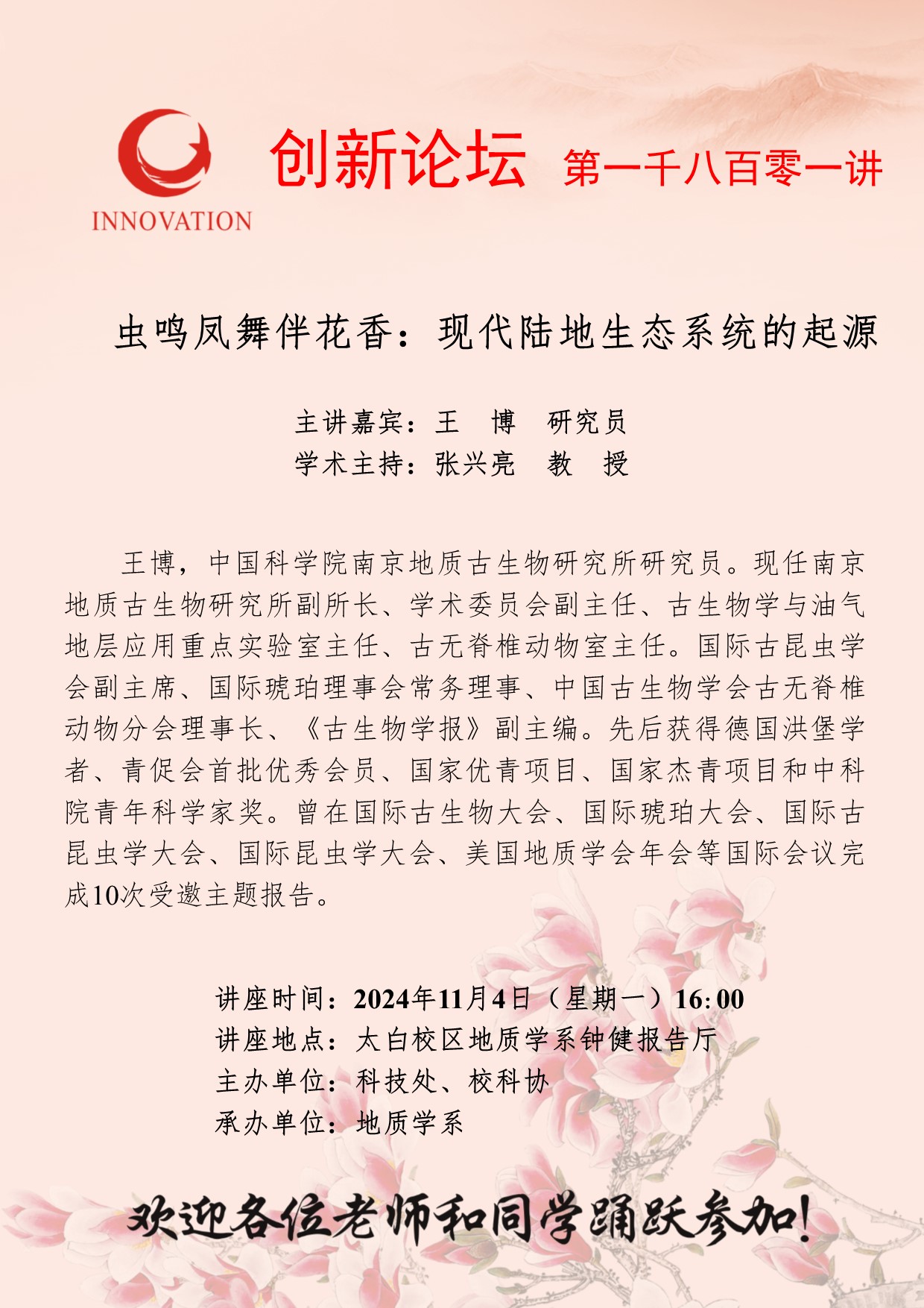 王 博 研究员 bat365正版唯一官网创新论坛第一千八百零一讲:虫鸣凤舞伴花香:现代陆地生态系统的起源 讲座时间 2024年11月4日(星期一)16:00 讲座地点 太白校区地质学系钟健报告厅 讲座人介绍 王 博 研究员 讲座内容