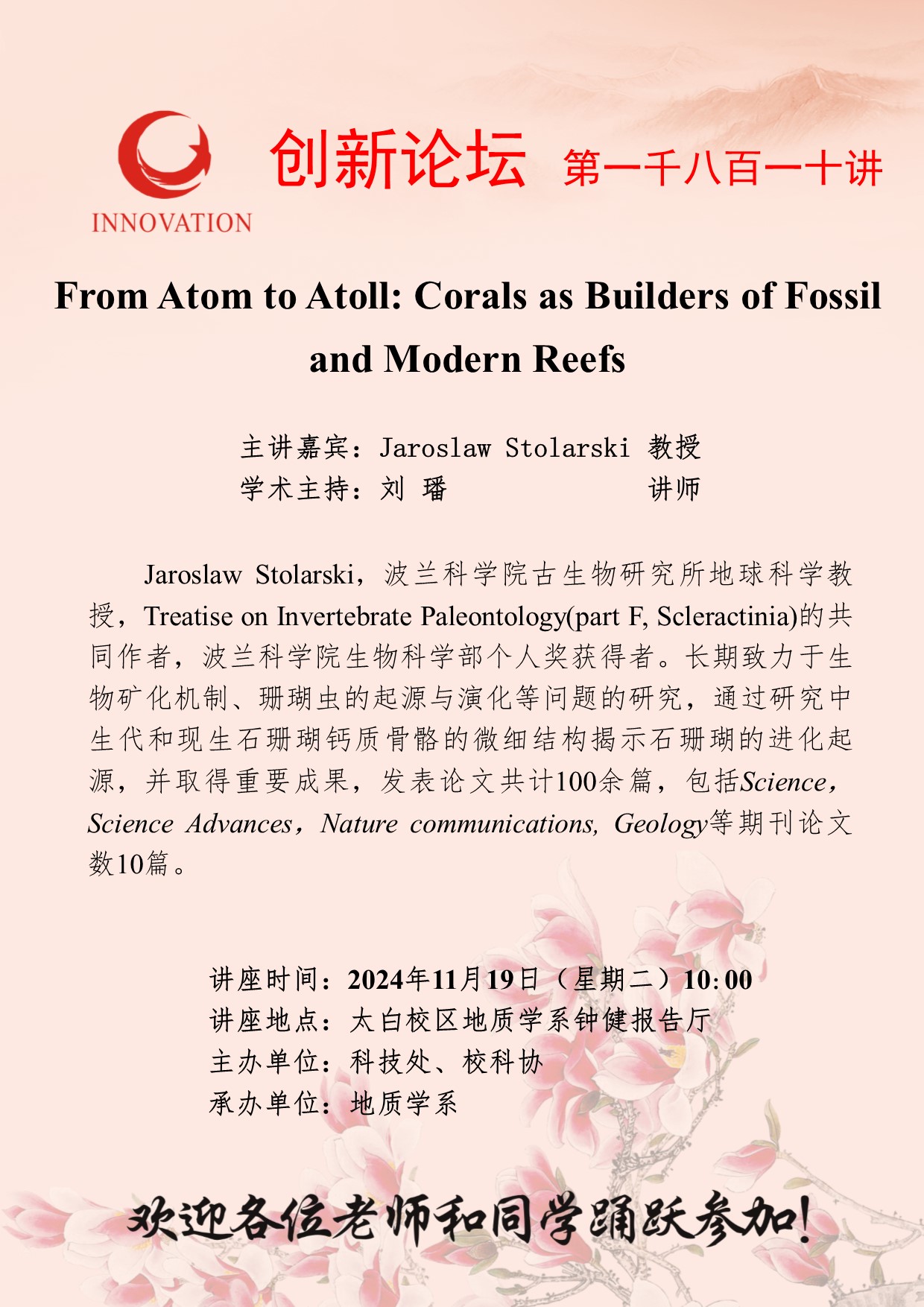 Jaroslaw Stolarski 教授 bat365正版唯一官网创新论坛第一千八百一十讲:From Atom to Atoll: Corals as Builders of Fossil and Modern Reefs 讲座时间 2024年11月19日(星期二)10:00 讲座地点 太白校区地质学系钟健报告厅 讲座人介绍 Jaroslaw Stolarski 教授 讲座内容