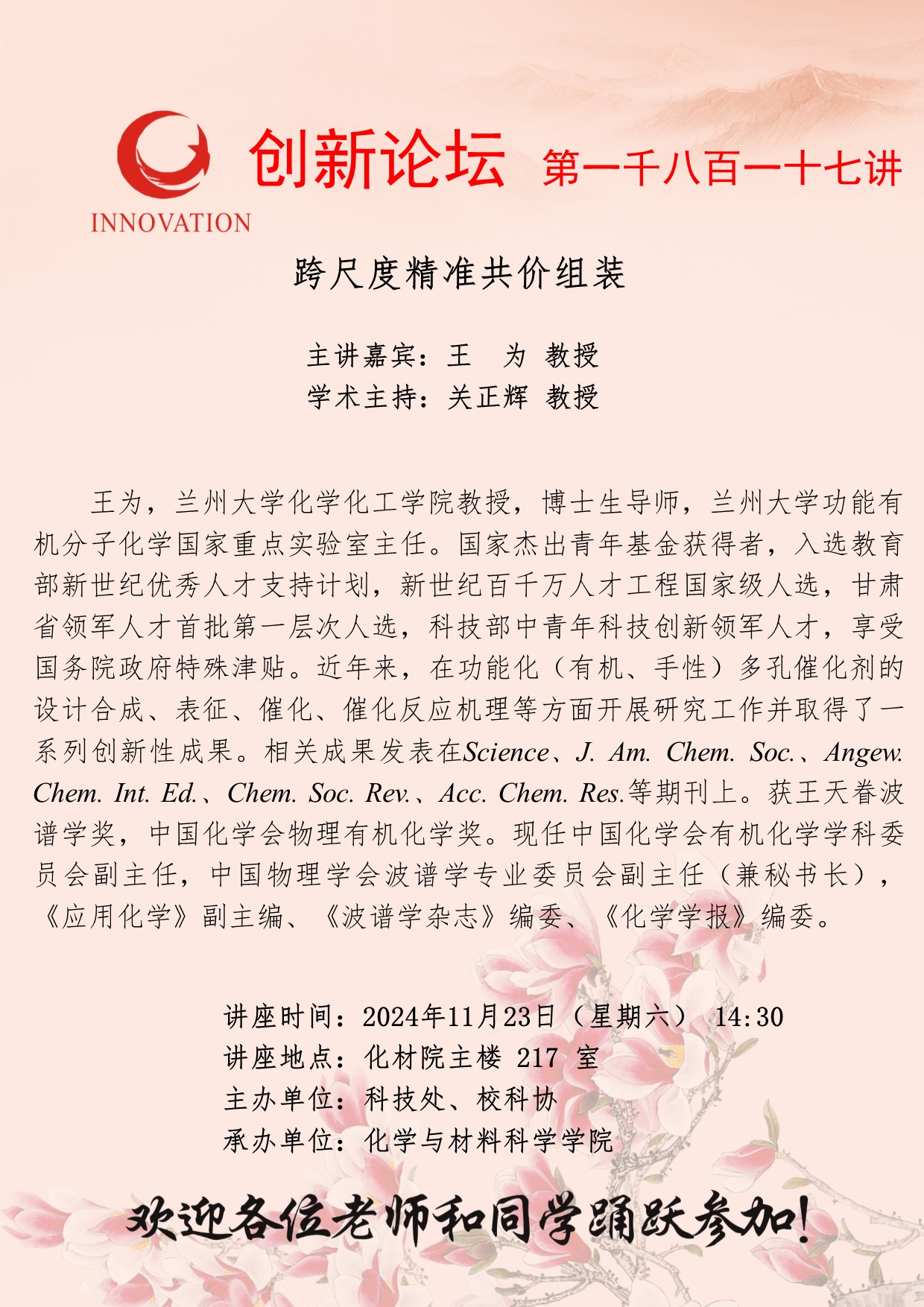 王为 教授 bat365正版唯一官网创新论坛第一千八百一十七讲:跨尺度精准共价组装 讲座时间 2024年11月23日(星期六) 14:30 讲座地点 化材院主楼 217 室 讲座人介绍 王为 教授 讲座内容