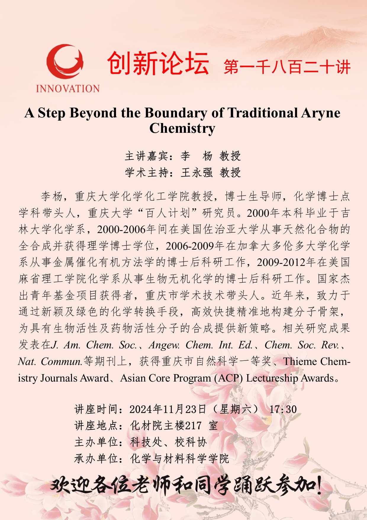 李杨 教授 bat365正版唯一官网创新论坛第一千八百二十讲:A Step Beyond the Boundary of Traditional Aryne Chemistry 讲座时间 2024年11月23日(星期六) 17:30 讲座地点 化材院主楼217室 讲座人介绍 李杨 教授 讲座内容