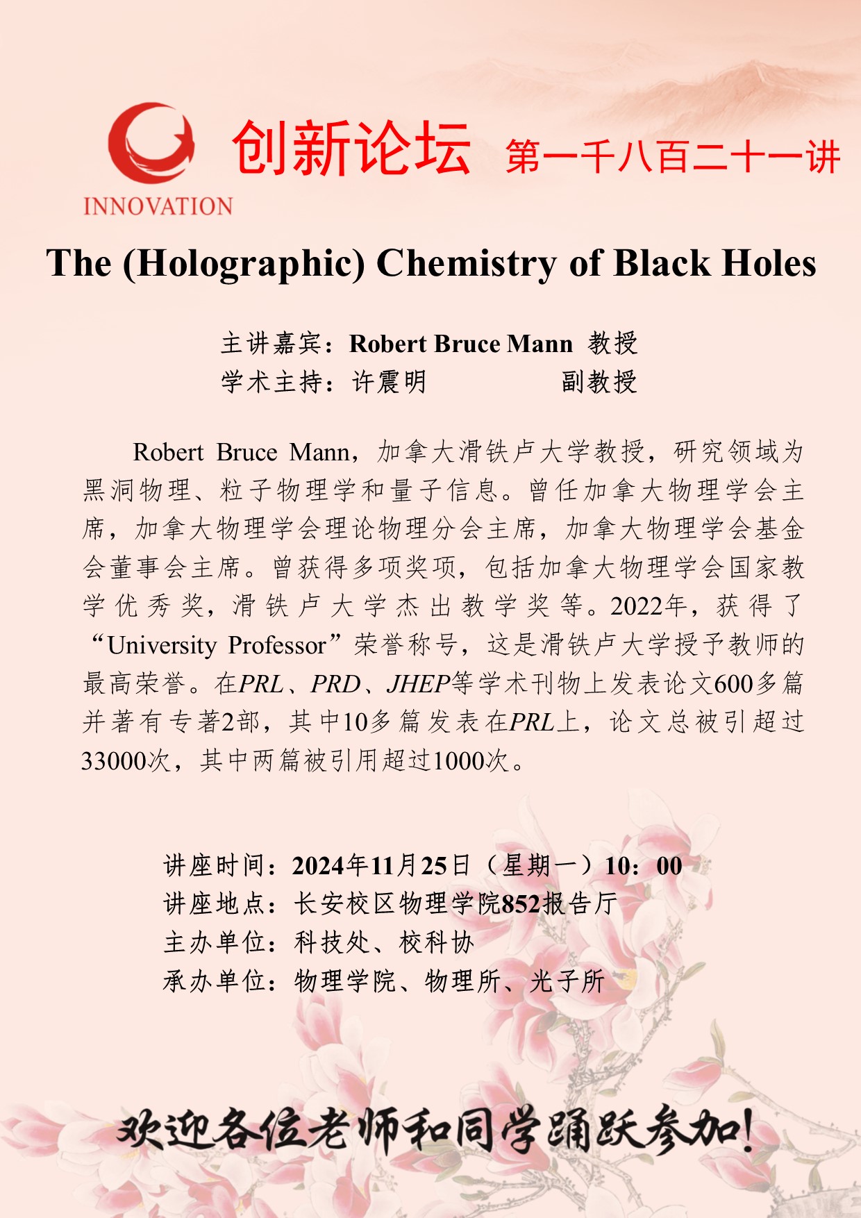 Robert Bruce Mann 教授 bat365正版唯一官网创新论坛第一千八百二十一讲:The (Holographic) Chemistry of Black Holes 讲座时间 2024年11月25日(星期一)10:00 讲座地点 长安校区物理学院852报告厅 讲座人介绍 Robert Bruce Mann 教授 讲座内容