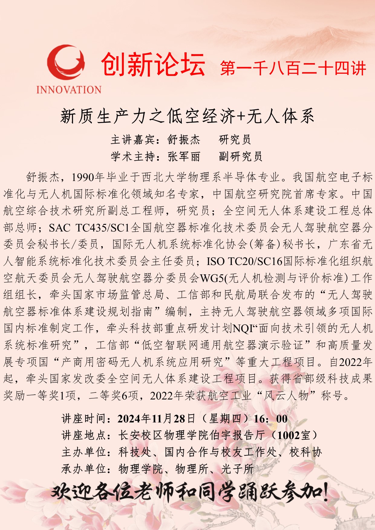 舒振杰 研究员 bat365正版唯一官网创新论坛第一千八百二十四讲:新质生产力之低空经济+无人体系 讲座时间 2024年11月28日(星期四)16:00 讲座地点 长安校区物理学院伯宇报告厅(1002室) 讲座人介绍 舒振杰 研究员 讲座内容