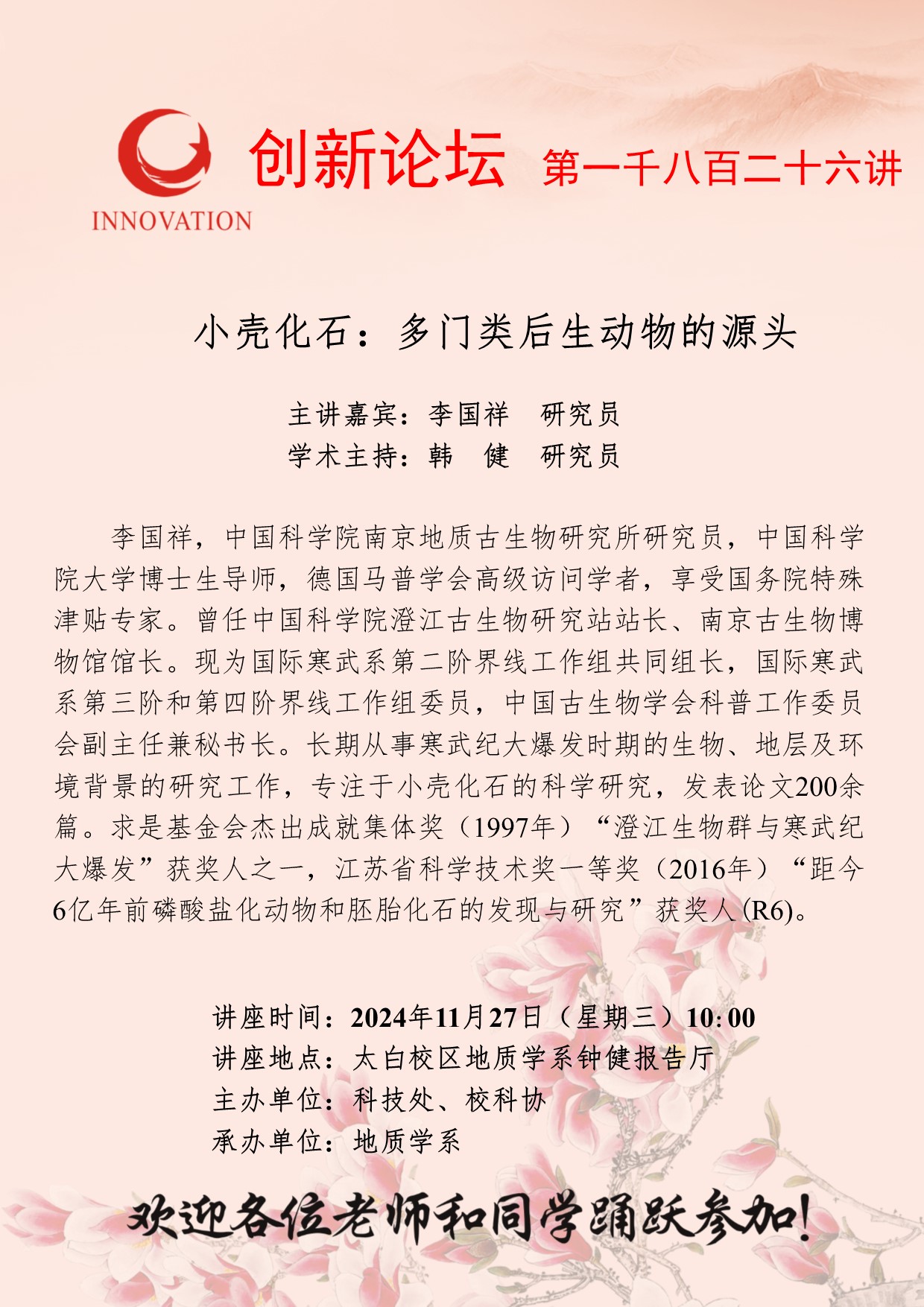 李国祥 研究员 bat365正版唯一官网创新论坛第一千八百二十六讲:小壳化石:多门类后生动物的源头 讲座时间 2024年11月27日(星期三)10:00 讲座地点 太白校区地质学系钟健报告厅 讲座人介绍 李国祥 研究员 讲座内容