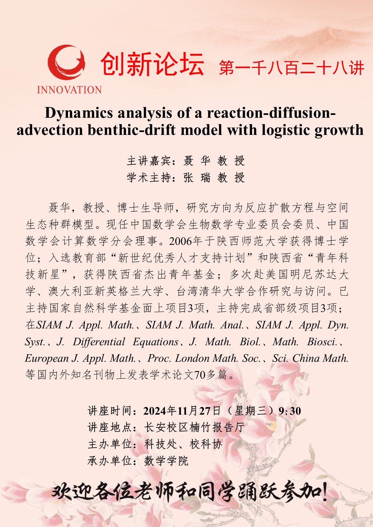聂华 教授 bat365正版唯一官网创新论坛第一千八百二十八讲:Dynamics analysis of a reaction-diffusion-advection benthic-drift model with logistic growth 讲座时间 2024年11月27日(星期三)9:30 讲座地点 长安校区楠竹报告厅 讲座人介绍 聂华 教授 讲座内容