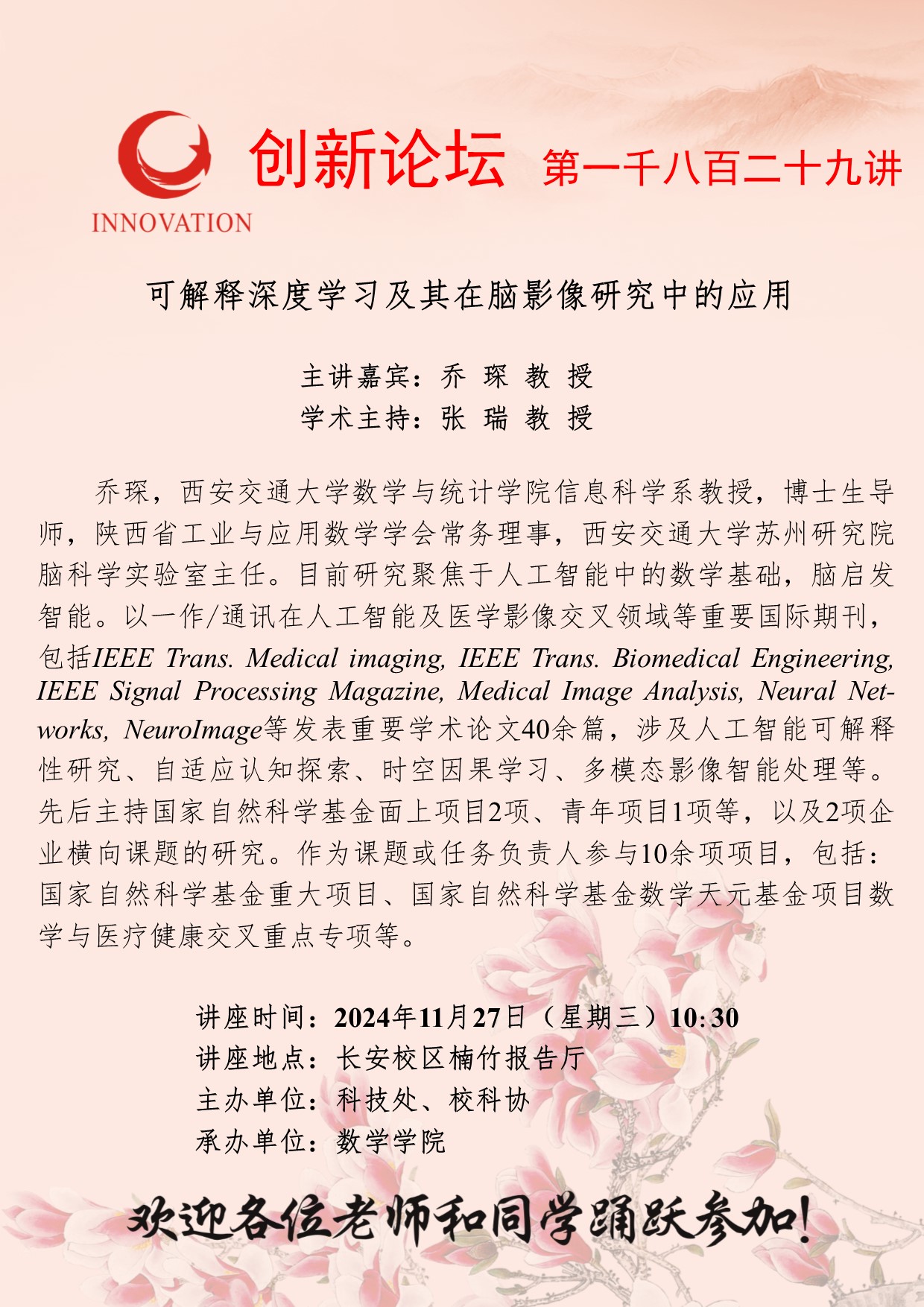 乔琛 教授 bat365正版唯一官网创新论坛第一千八百二十九讲:可解释深度学习及其在脑影像研究中的应用 讲座时间 2024年11月27日(星期三)10:30 讲座地点 长安校区楠竹报告厅 讲座人介绍 乔琛 教授 讲座内容