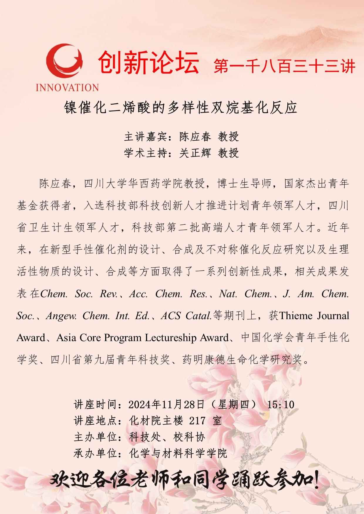 陈应春 教授 bat365正版唯一官网创新论坛第一千八百三十三讲:镍催化二烯酸的多样性双烷基化反应 讲座时间 2024年11月28日(星期四) 15:10 讲座地点 化材院主楼217室 讲座人介绍 陈应春 教授 讲座内容