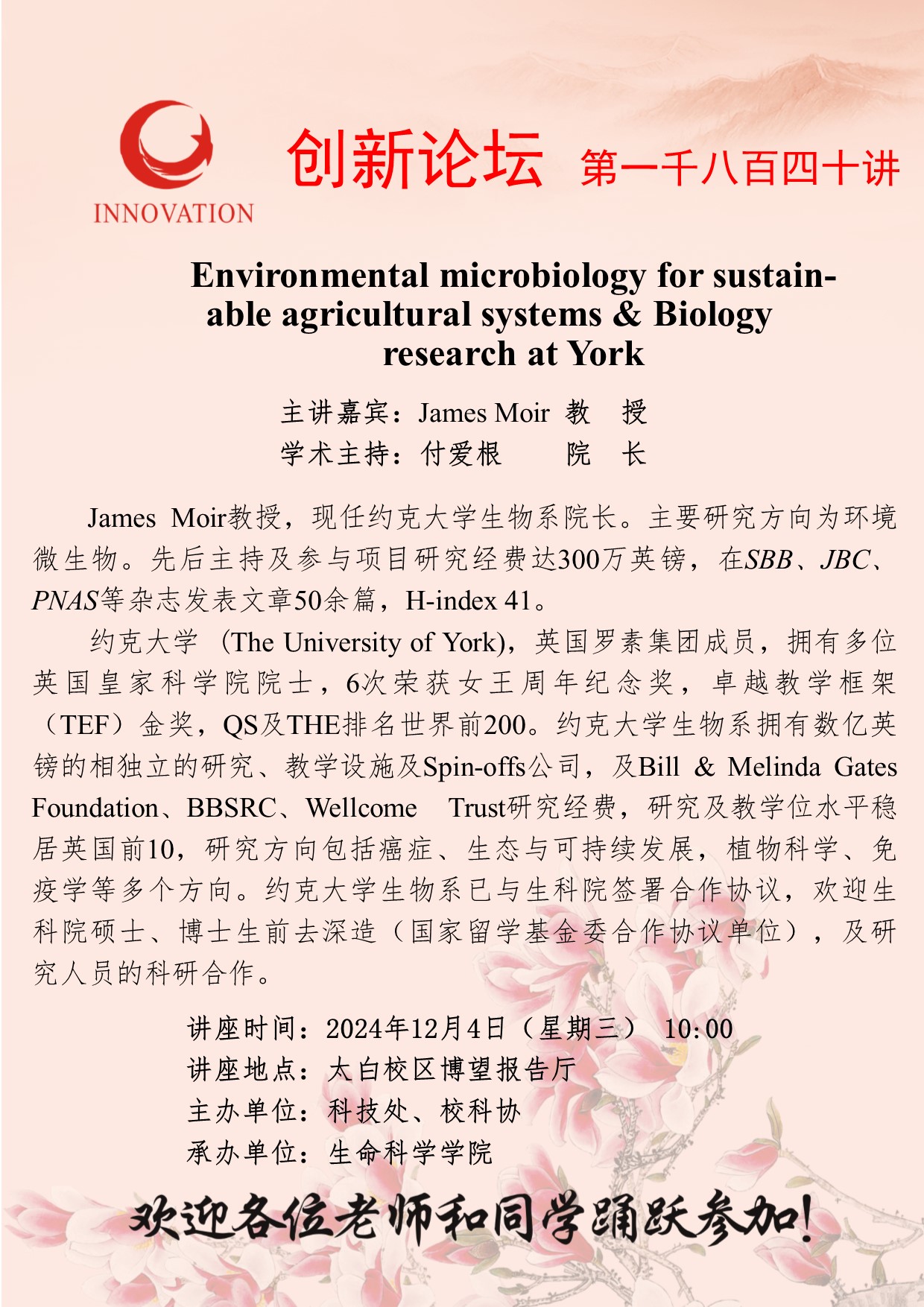 James Moir 教授 bat365正版唯一官网创新论坛第一千八百四十讲:Environmental microbiology for sustainable agricultural systems & Biology research at York 讲座时间 2024年12月4日(星期三) 10:00 讲座地点 太白校区博望报告厅 讲座人介绍 James Moir 教授 讲座内容