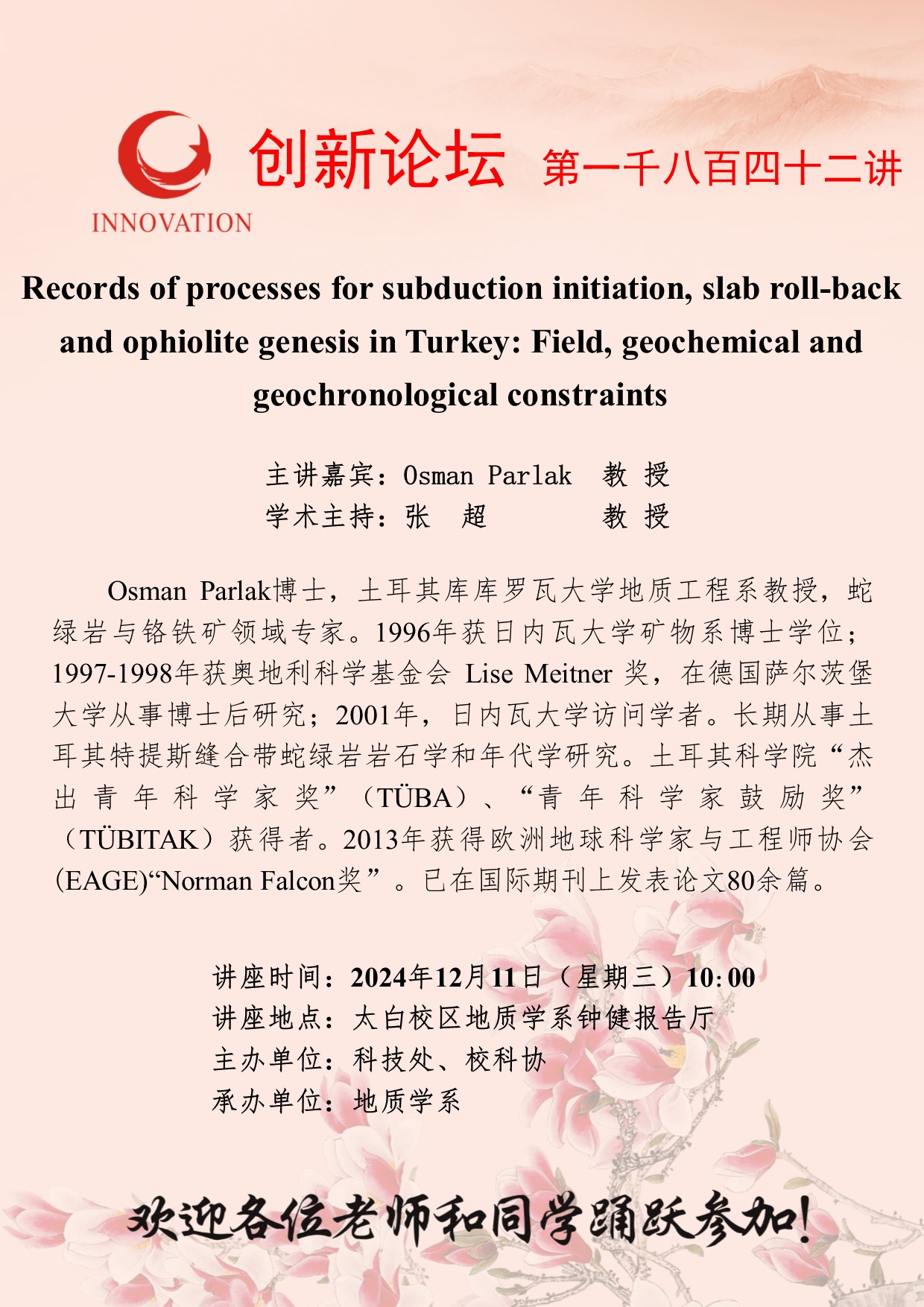 Osman Parlak 教授 bat365正版唯一官网创新论坛第一千八百四十二讲:Records of processes for subduction initiation, slab roll-back and ophiolite genesis in Turkey: Field, geochemical and geochronological constraints 讲座时间 2024年12月11日(星期三)10:00 讲座地点 太白校区地质学系钟健报告厅 讲座人介绍 Osman Parlak 教授 讲座内容
