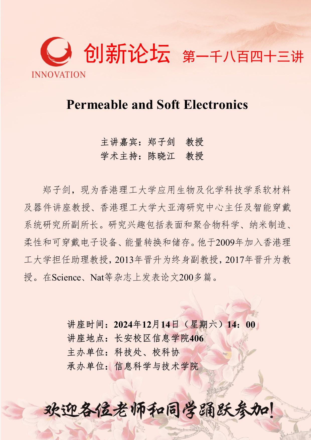 郑子剑 教授 bat365正版唯一官网创新论坛第一千八百四十三讲:Permeable and Soft Electronics 讲座时间 2024年12月14日(星期六)14:00 讲座地点 长安校区信息学院406 讲座人介绍 郑子剑 教授 讲座内容