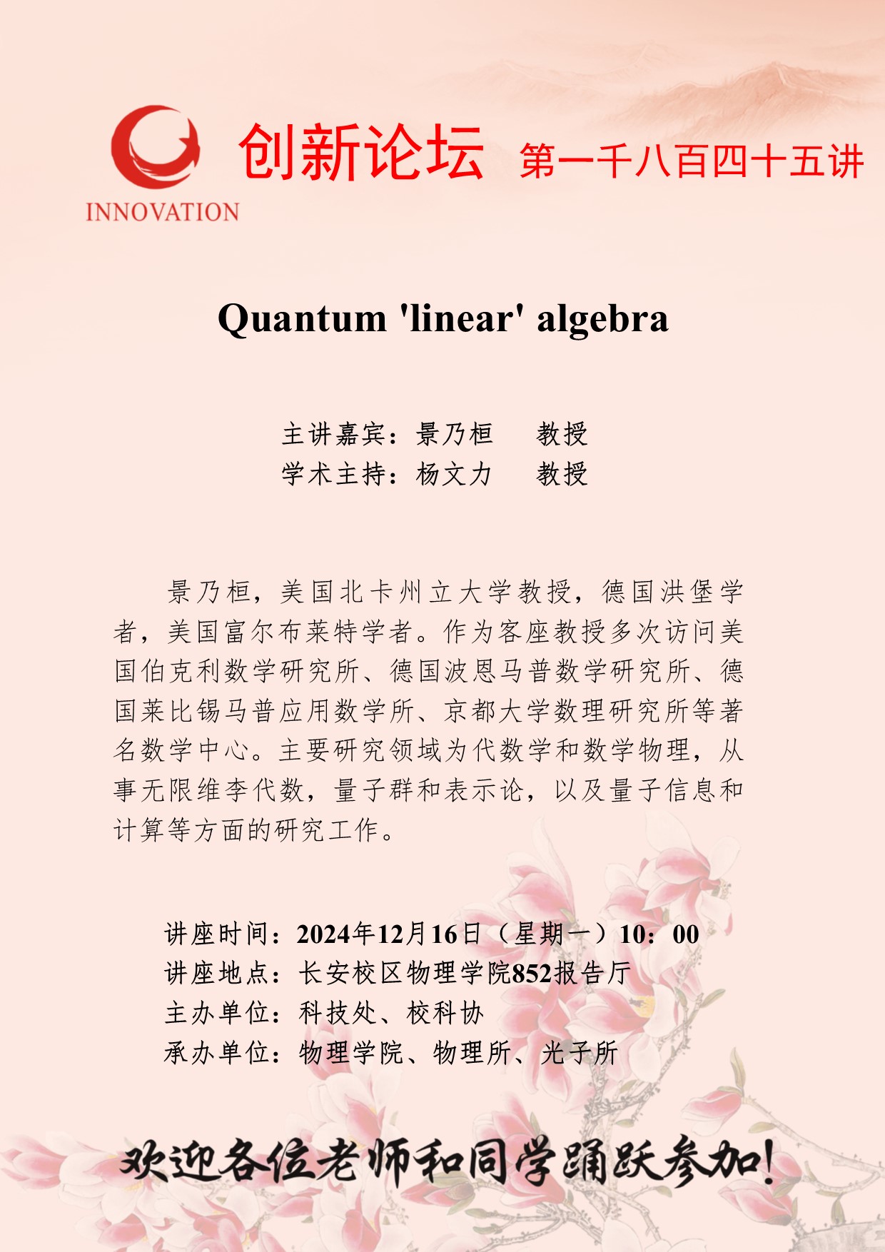 景乃桓 教授 bat365正版唯一官网创新论坛第一千八百四十五讲:Quantum 'linear' algebra 讲座时间 2024年12月16日(星期一)10:00 讲座地点 长安校区物理学院852报告厅 讲座人介绍 景乃桓 教授 讲座内容