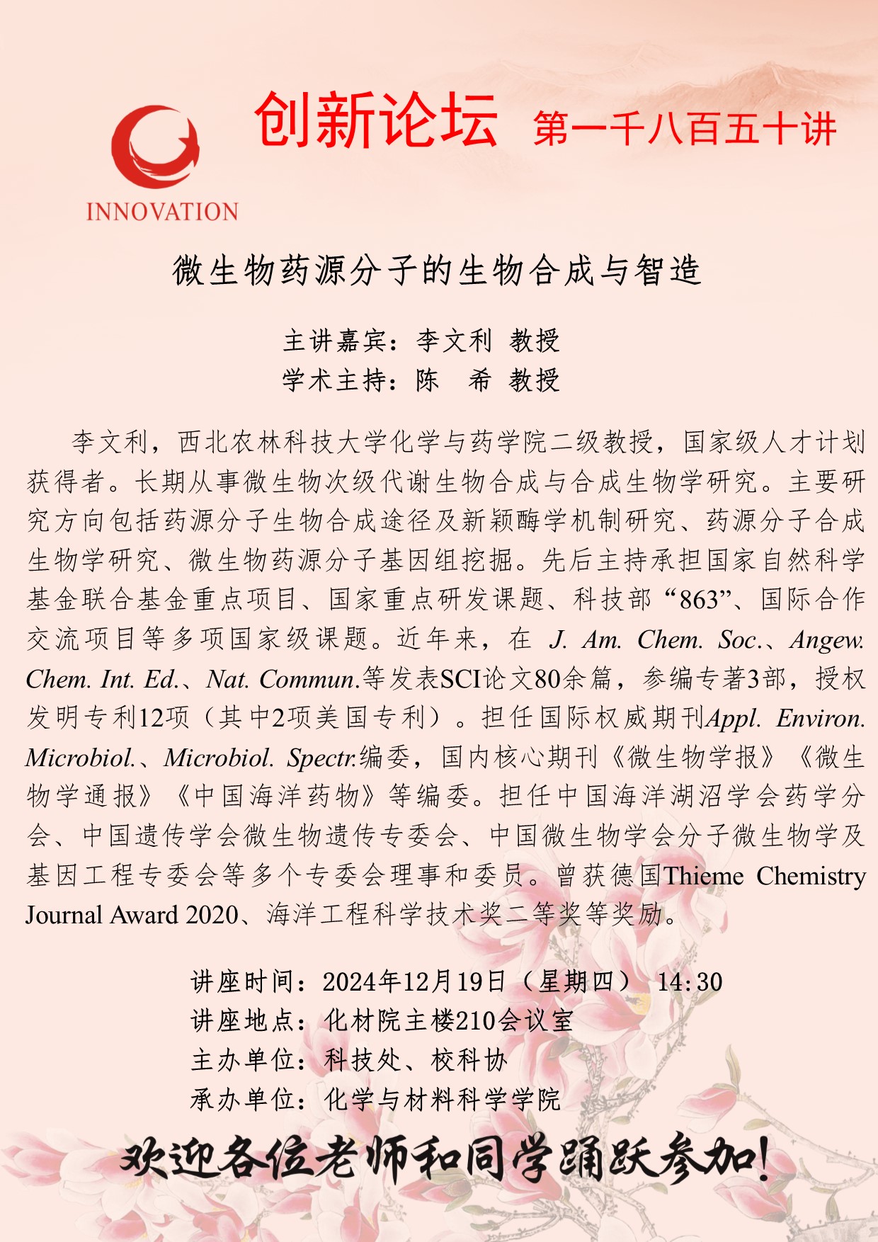 李文利 教授 bat365正版唯一官网创新论坛第一千八百五十讲:微生物药源分子的生物合成与智造 讲座时间 2024年12月19日(星期四) 14:30 讲座地点 化材院主楼210会议室 讲座人介绍 李文利 教授 讲座内容