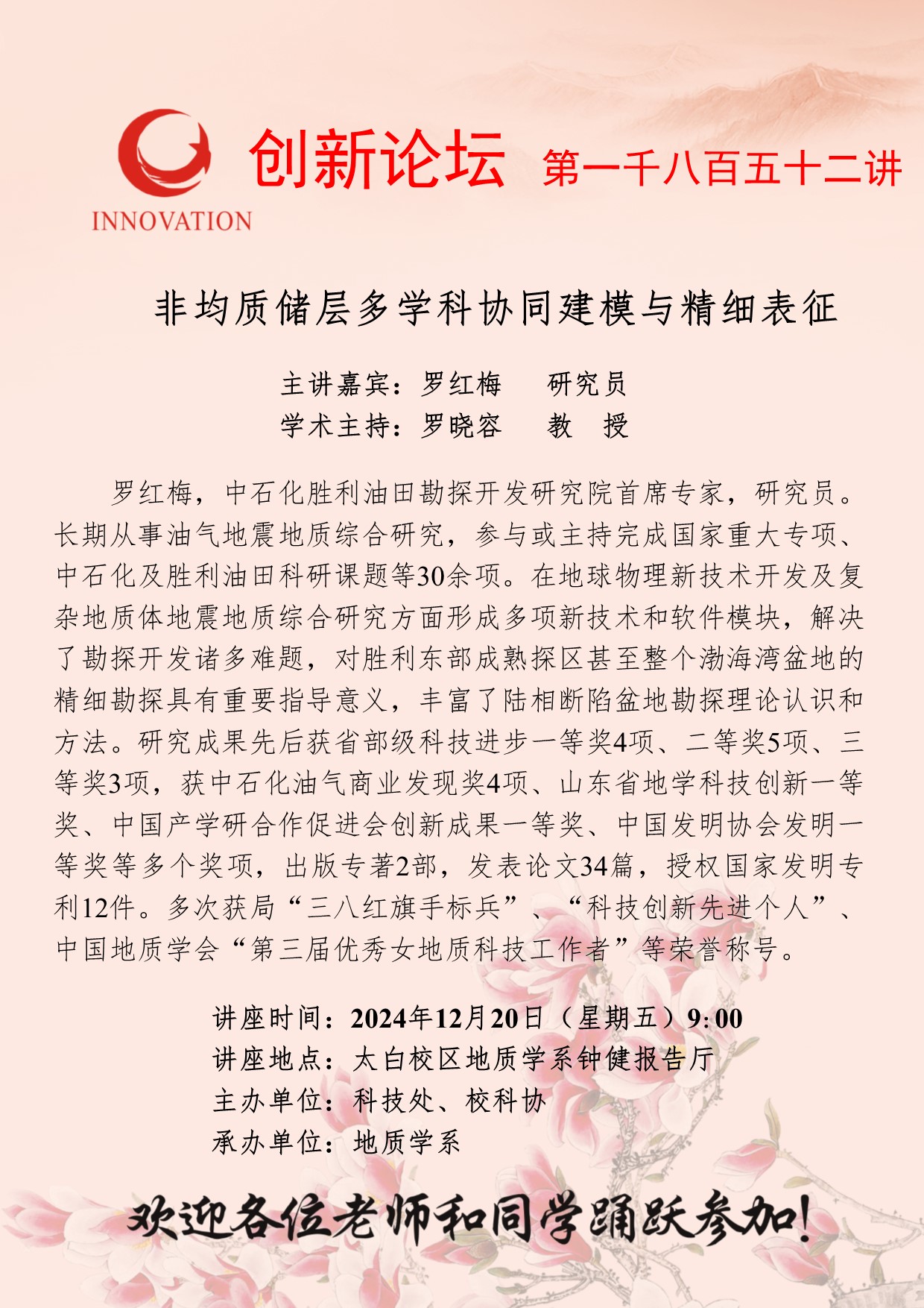 罗红梅 研究员 bat365正版唯一官网创新论坛第一千八百五十二讲:非均质储层多学科协同建模与精细表征 讲座时间 2024年12月20日(星期五)9:00 讲座地点 太白校区地质学系钟健报告厅 讲座人介绍 罗红梅 研究员 讲座内容
