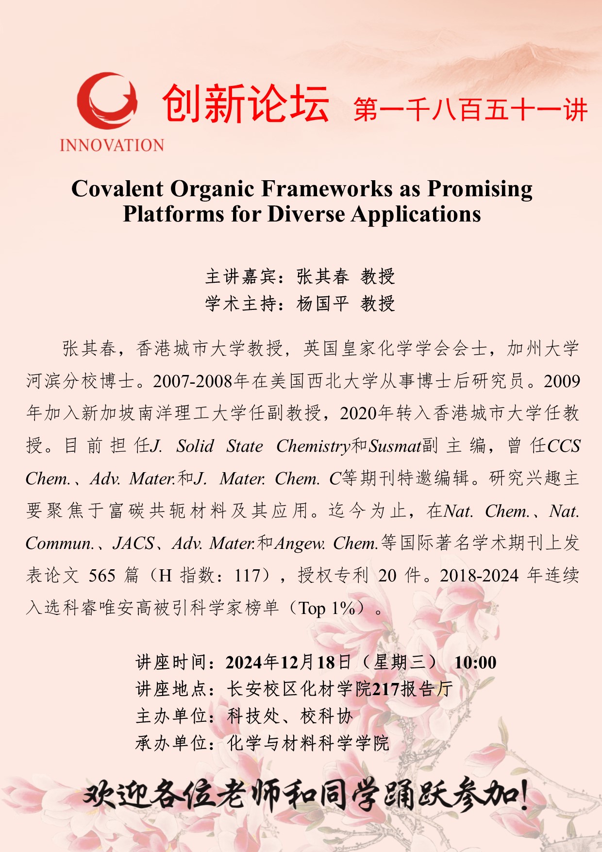 张其春 教授 bat365正版唯一官网创新论坛第一千八百五十一讲:Covalent Organic Frameworks as Promising Platforms for Diverse Applications 讲座时间 2024年12月18日(星期三) 10:00 讲座地点 长安校区化材学院217报告厅 讲座人介绍 张其春 教授 讲座内容
