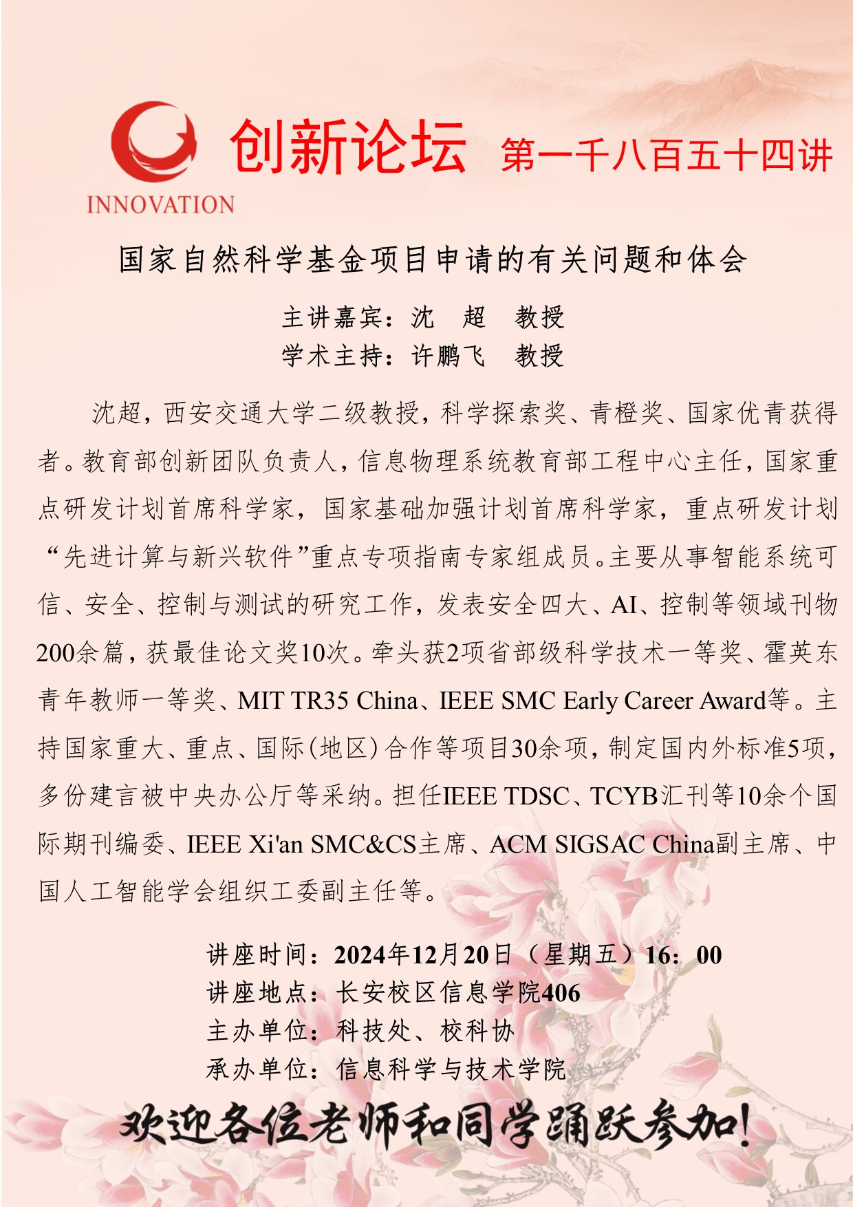 沈超 教授 bat365正版唯一官网创新论坛第一千八百五十四讲:国家自然科学基金项目申请的有关问题和体会 讲座时间 2024年12月20日(星期五) 16:00 讲座地点 长安校区信息学院406 讲座人介绍 沈超 教授 讲座内容