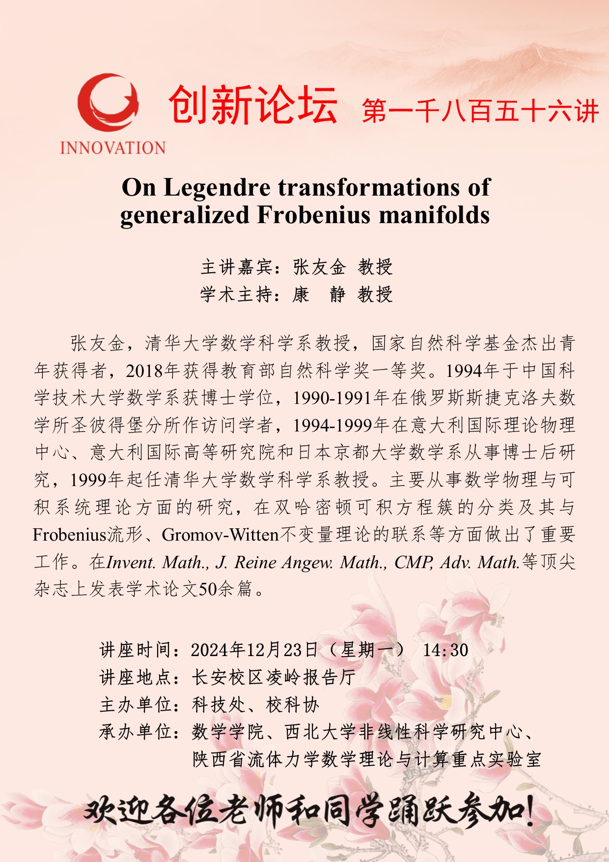 张友金 教授 bat365正版唯一官网创新论坛第一千八百五十六讲:On Legendre transformations of generalized Frobenius manifolds 讲座时间 2024年12月23日(星期一) 14:30 讲座地点 长安校区凌岭报告厅 讲座人介绍 张友金 教授 讲座内容