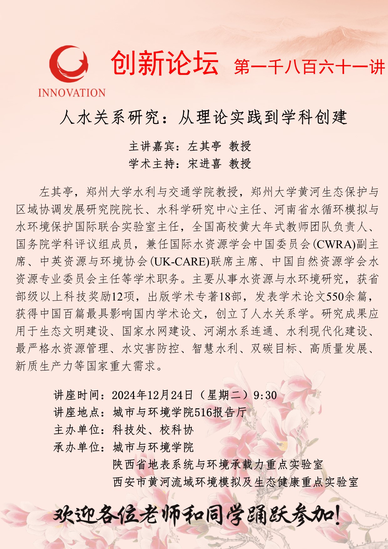 左其亭 教授 bat365正版唯一官网创新论坛第一千八百六十一讲:人水关系研究:从理论实践到学科创建 讲座时间 2024年12月24日(星期二)9:30 讲座地点 城市与环境学院516报告厅 讲座人介绍 左其亭 教授 讲座内容