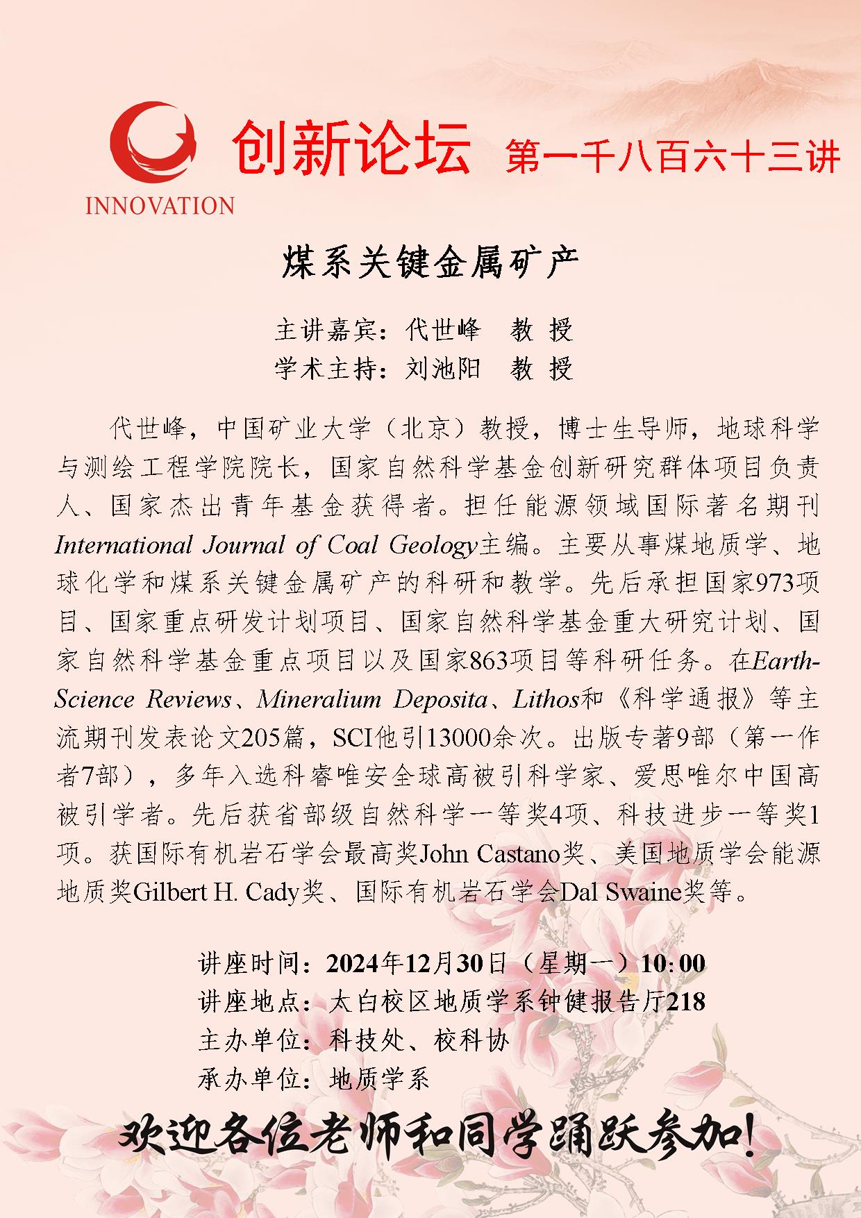 代世峰 教授 bat365正版唯一官网创新论坛第一千八百六十三讲:煤系关键金属矿产 讲座时间 2024年12月30日(星期一)10:00 讲座地点 太白校区地质学系钟健报告厅218 讲座人介绍 代世峰 教授 讲座内容