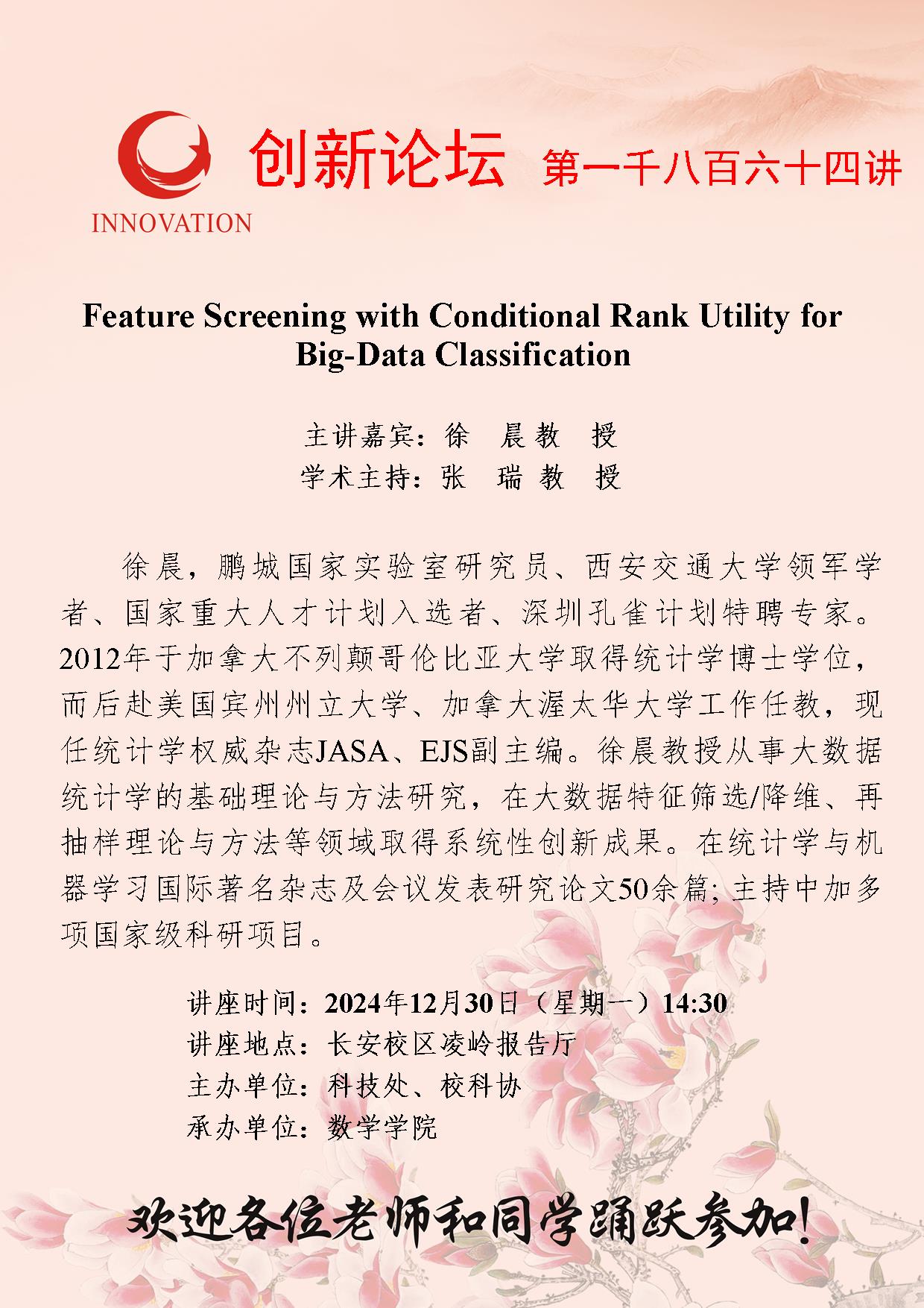 徐晨 教授 bat365正版唯一官网创新论坛第一千八百六十四讲:Feature Screening with Conditional Rank Utility for Big-Data Classification 讲座时间 2024年12月30日(星期一)14:30 讲座地点 长安校区凌岭报告厅 讲座人介绍 徐晨 教授 讲座内容