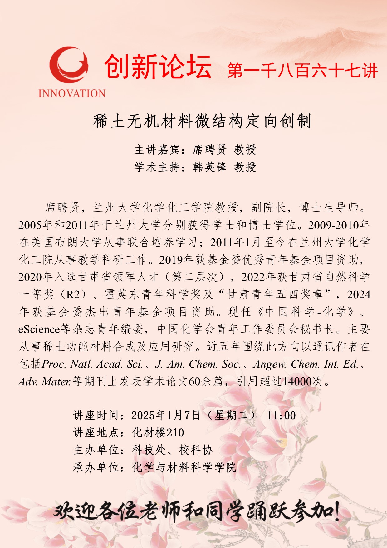 席聘贤 教授 bat365正版唯一官网创新论坛第一千八百六十七讲: 稀土无机材料微结构定向创制 讲座时间 2025年1月7日(星期二)11:00 讲座地点 化材楼210 讲座人介绍 席聘贤 教授 讲座内容