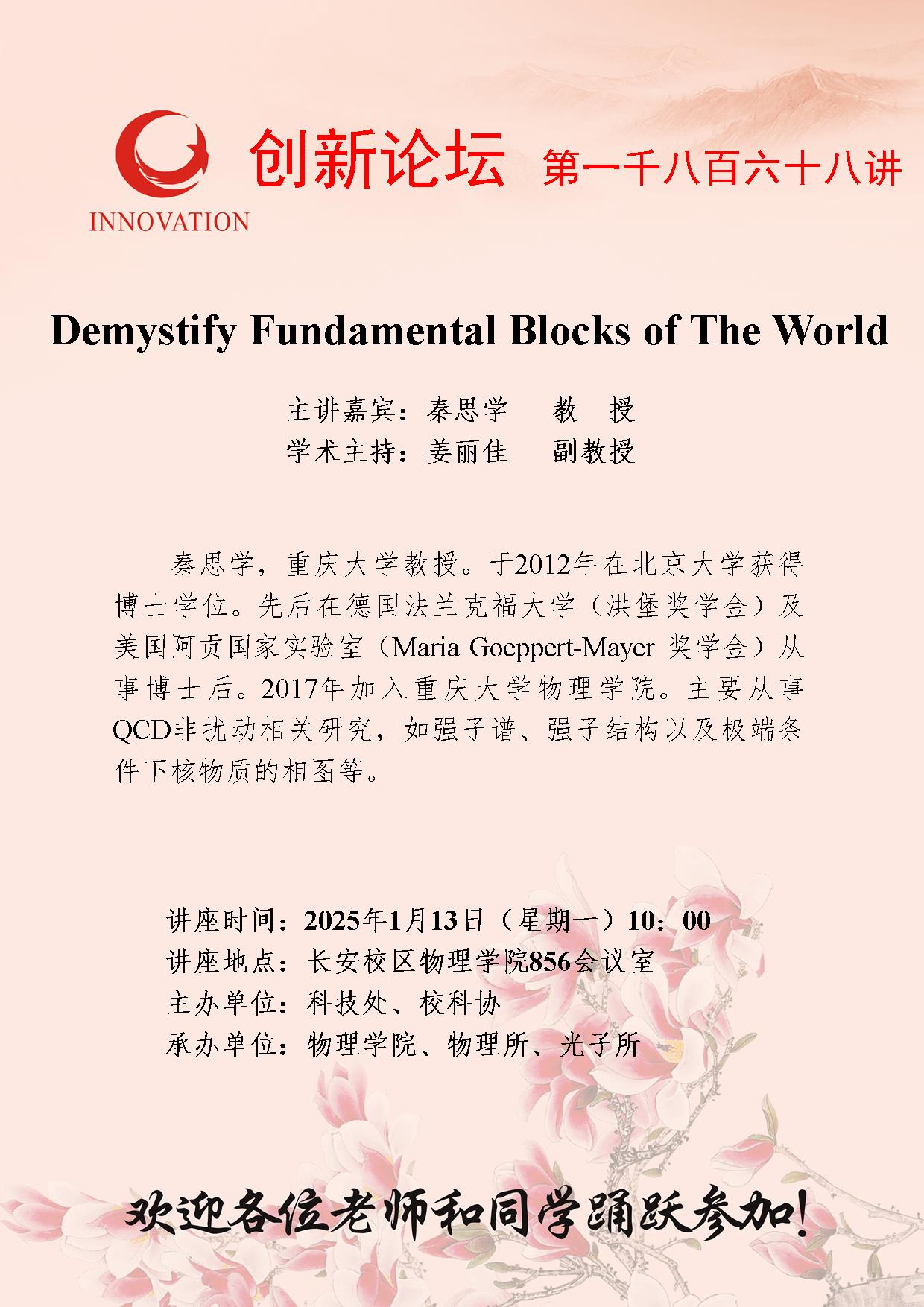 秦思学 教授 bat365正版唯一官网创新论坛第一千八百六十八讲:Demystify Fundamental Blocks of The World 讲座时间 2025年1月13日(星期一)10:00 讲座地点 长安校区物理学院856会议室 讲座人介绍 秦思学 教授 讲座内容
