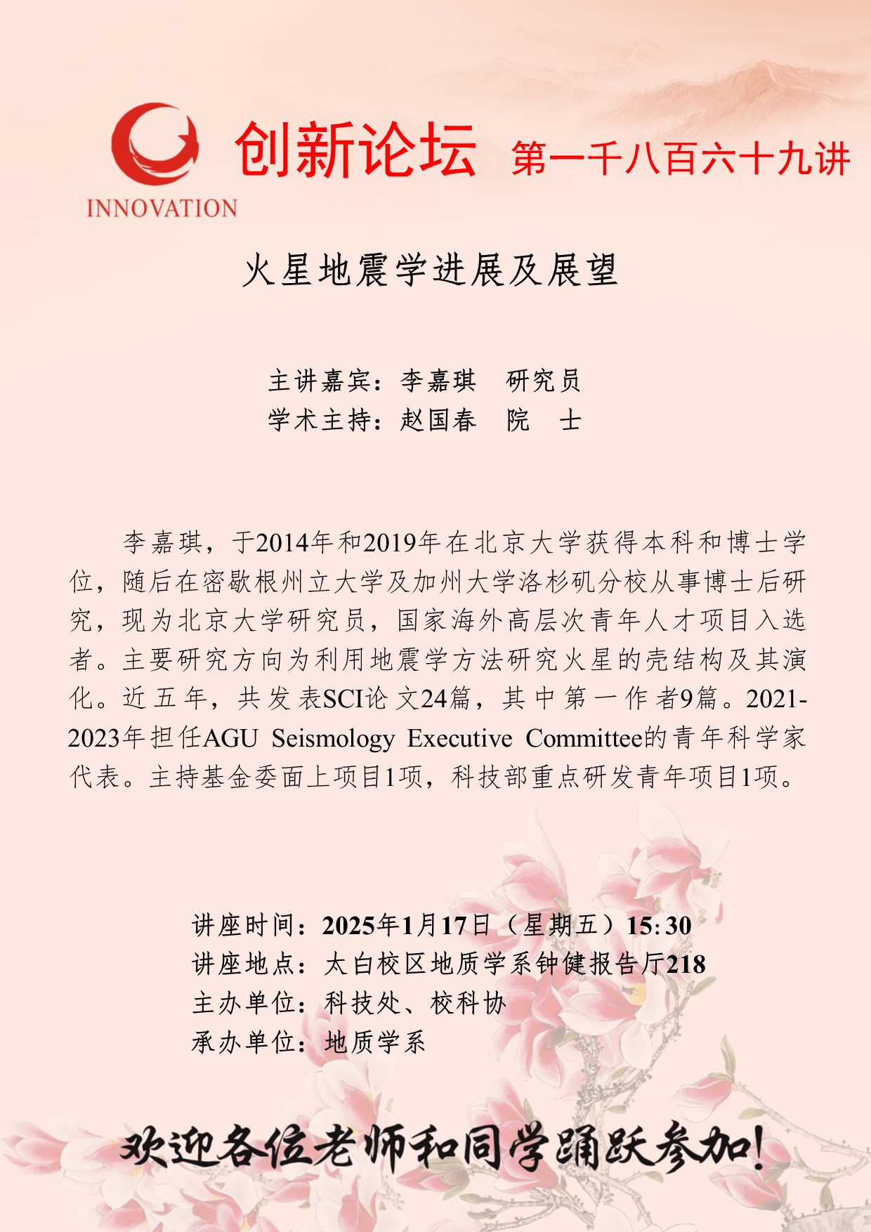 李嘉琪 研究员 bat365正版唯一官网创新论坛第一千八百六十九讲:火星地震学进展及展望 讲座时间 2025年1月17日(星期五)15:30 讲座地点 太白校区地质学系钟健报告厅218 讲座人介绍 李嘉琪 研究员 讲座内容