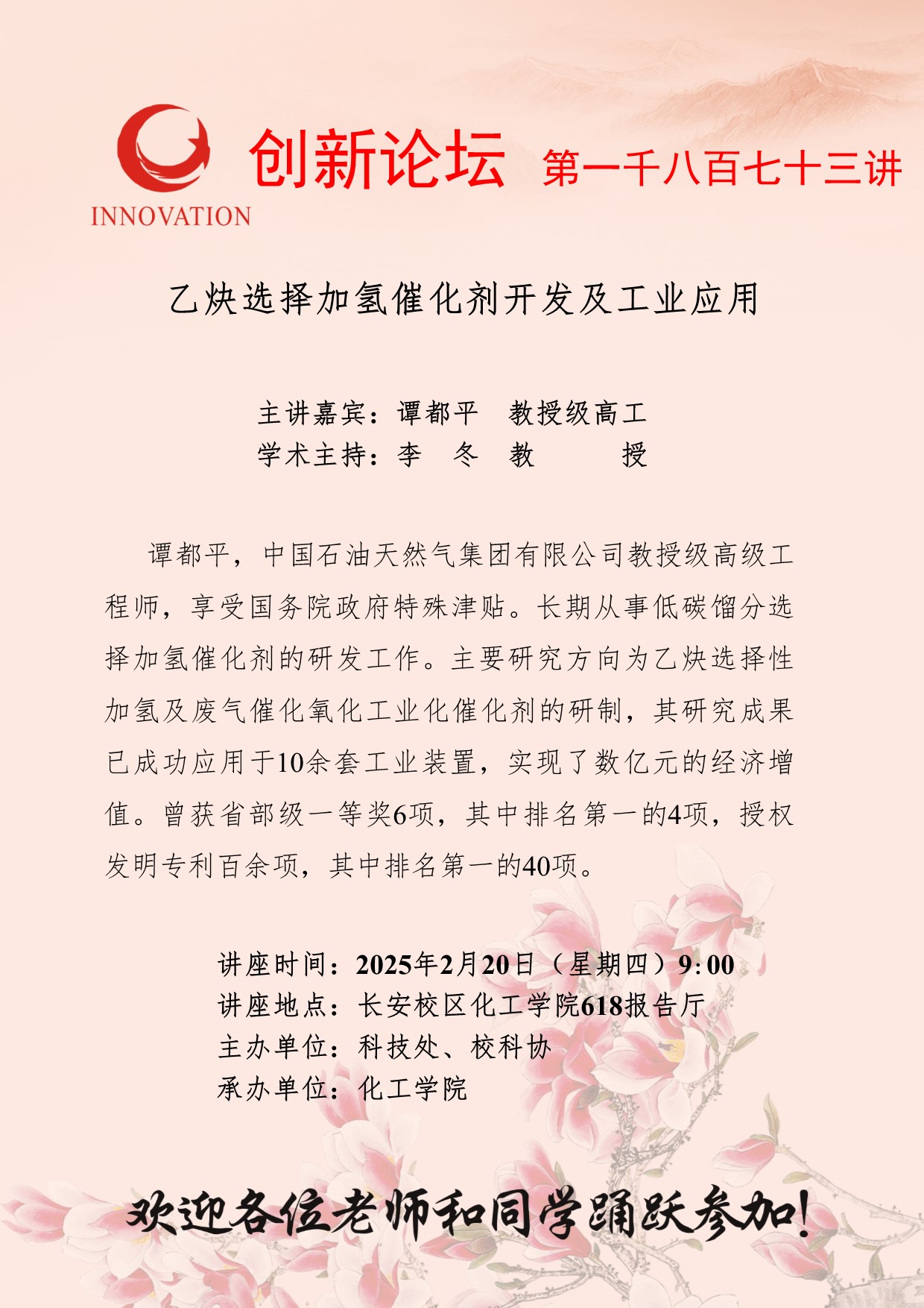 谭都平 教授级高工 bat365正版唯一官网创新论坛第一千八百七十三讲:乙炔选择加氢催化剂开发及工业应用 讲座时间 2025年2月20日(星期四)9:00 讲座地点 长安校区化工学院618报告厅 讲座人介绍 谭都平 教授级高工 讲座内容