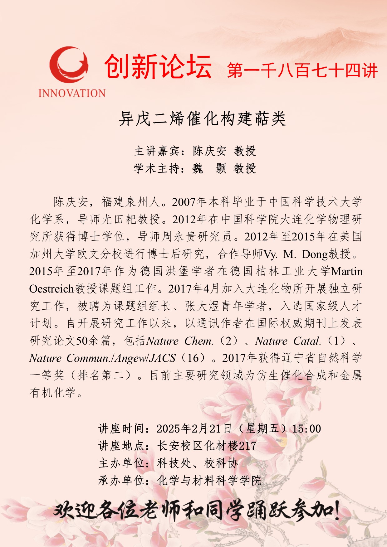 陈庆安 教授 bat365正版唯一官网创新论坛第一千八百七十四讲: 异戊二烯催化构建萜类 讲座时间 2025年2月21日(星期五)15:00 讲座地点 长安校区化材楼217 讲座人介绍 陈庆安 教授 讲座内容