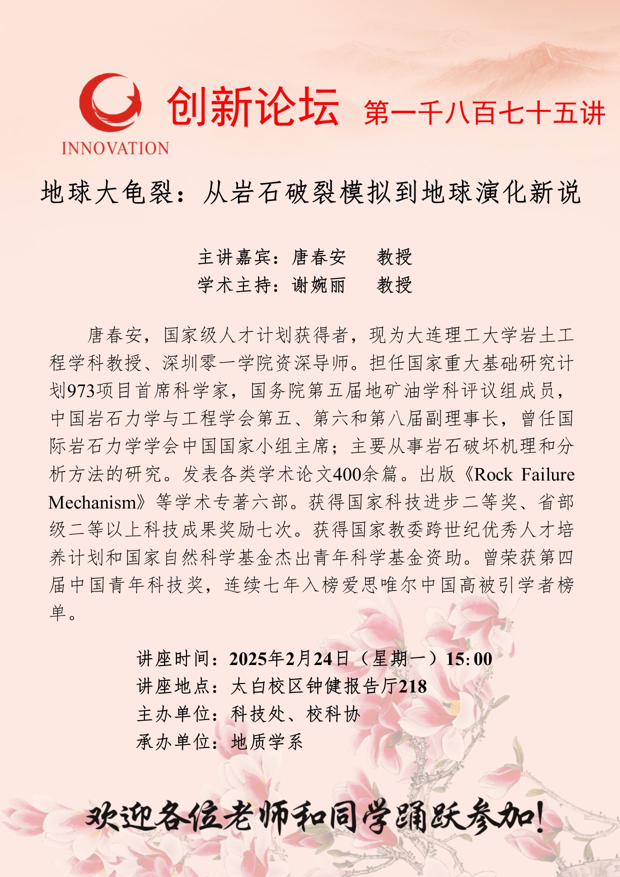 唐春安 教授 bat365正版唯一官网创新论坛第一千八百七十五讲:地球大龟裂:从岩石破裂模拟到地球演化新说 讲座时间 2025年2月24日(星期一)15:00 讲座地点 太白校区钟健报告厅218 讲座人介绍 唐春安 教授 讲座内容