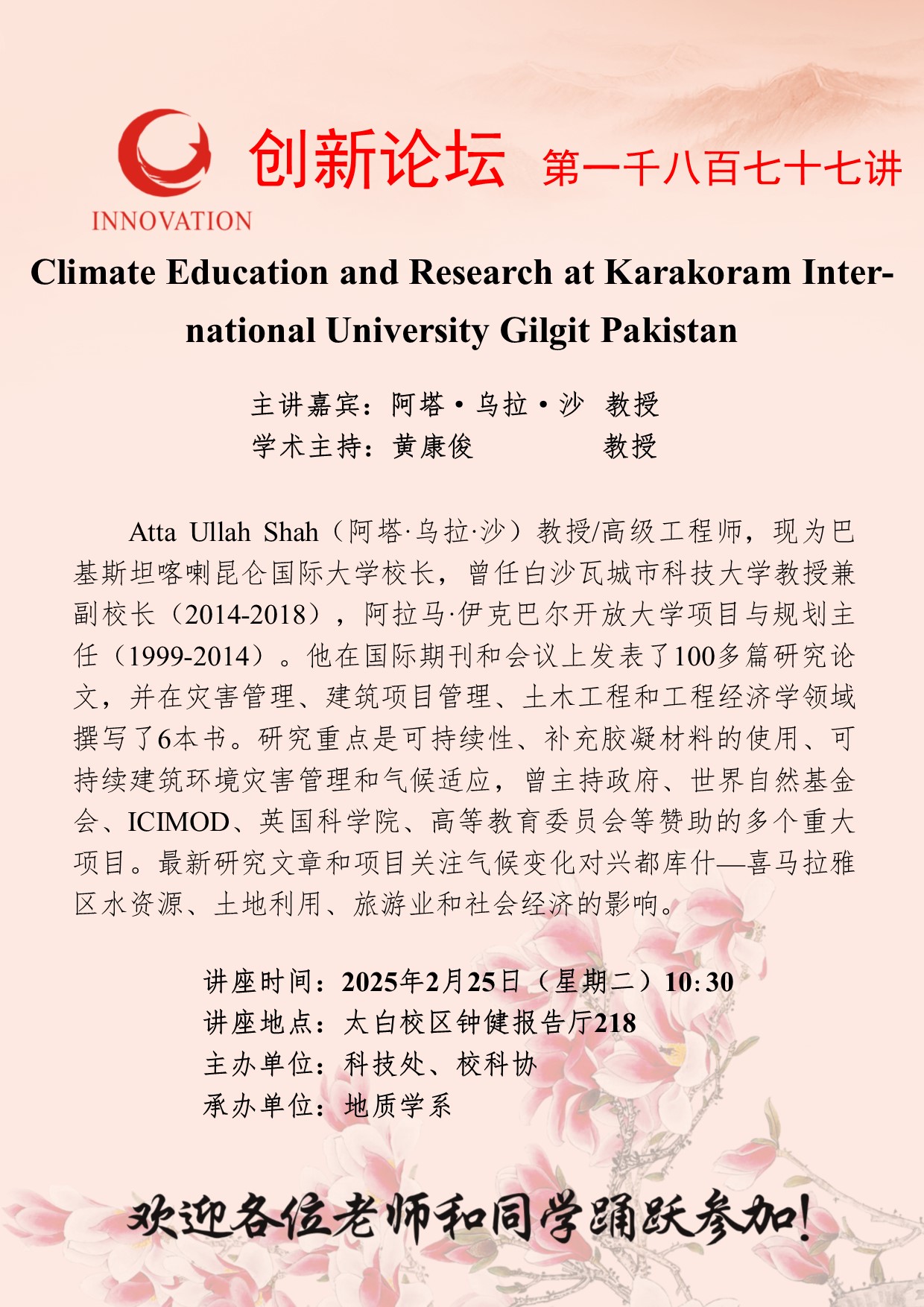 阿塔·乌拉·沙 教授 bat365正版唯一官网创新论坛第一千八百七十七讲:Climate Education and Research at Karakoram International University Gilgit Pakistan 讲座时间 2025年2月25日(星期二)10:30 讲座地点 太白校区钟健报告厅218 讲座人介绍 阿塔·乌拉·沙 教授 讲座内容