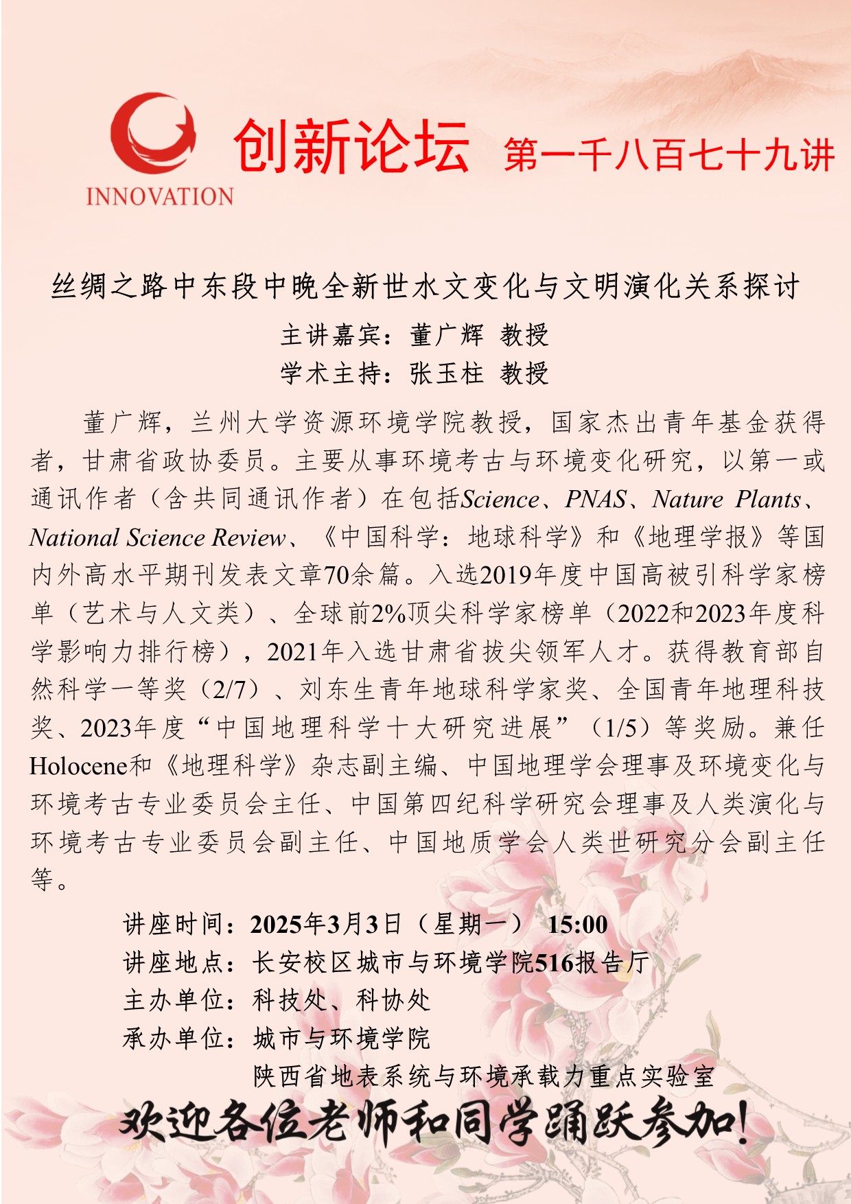 董广辉 教授 bat365正版唯一官网创新论坛第一千八百七十九讲:丝绸之路中东段中晚全新世水文变化与文明演化关系探讨 讲座时间 2025年3月3日(星期一) 15:00 讲座地点 长安校区城市与环境学院516报告厅 讲座人介绍 董广辉 教授 讲座内容