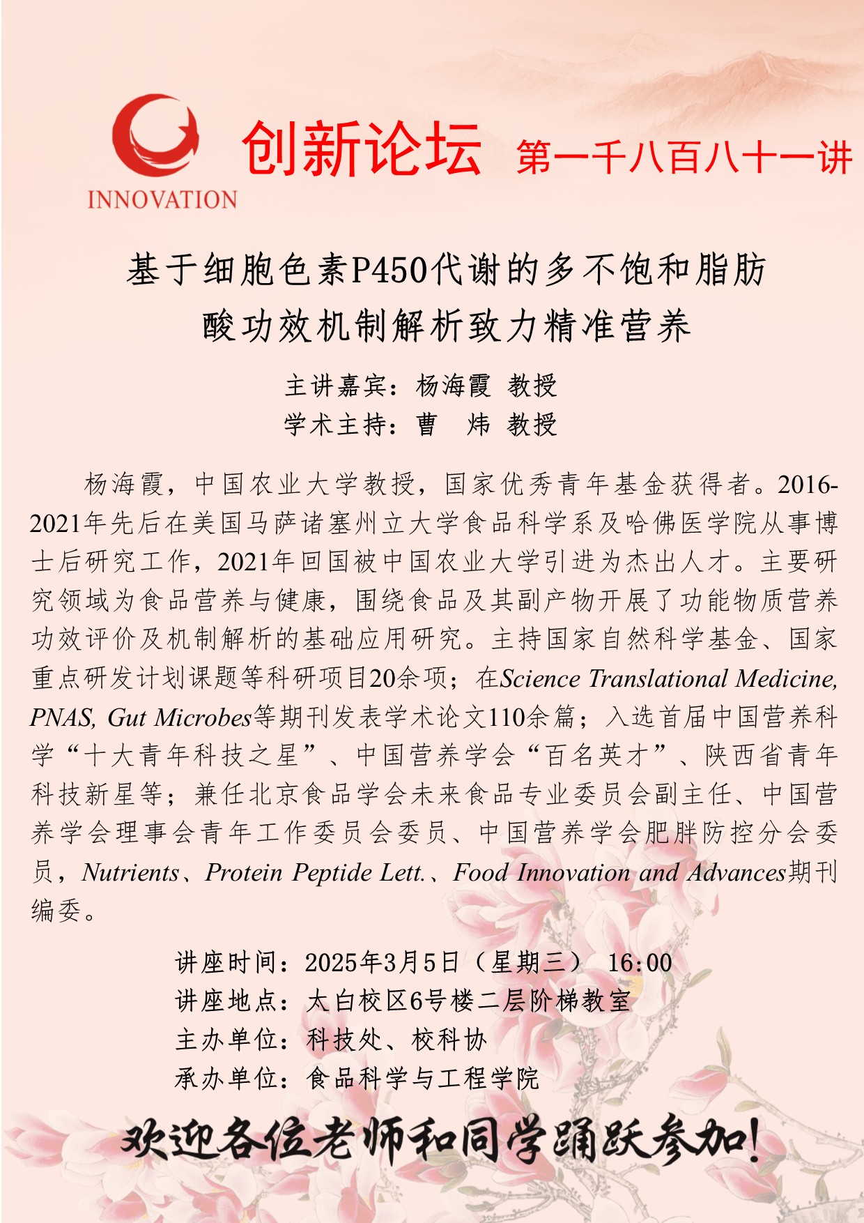 杨海霞 教授 bat365正版唯一官网创新论坛第一千八百八十一讲:基于细胞色素P450代谢的多不饱和脂肪酸功效机制解析致力精准营养 讲座时间 2025年3月5日(星期三)16:00 讲座地点 太白校区6号楼二层阶梯教室 讲座人介绍 杨海霞 教授 讲座内容