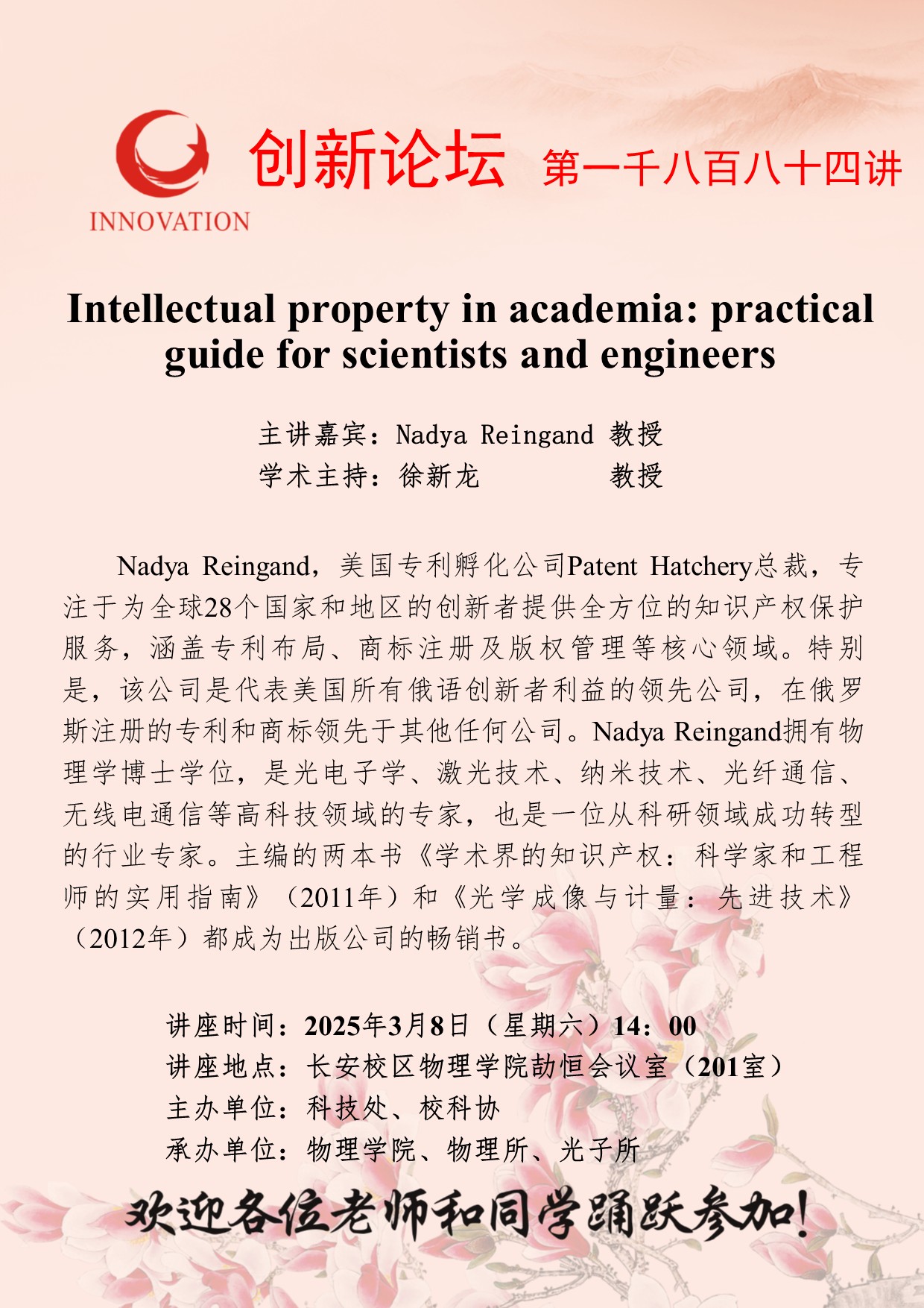 Nadya Reingand 教授 bat365正版唯一官网创新论坛第一千八百八十四讲:Intellectual property in academia: practical guide for scientists and engineers 讲座时间 2025年3月8日(星期六)14:00 讲座地点 长安校区物理学院劼恒会议室(201室) 讲座人介绍 Nadya Reingand 教授 讲座内容