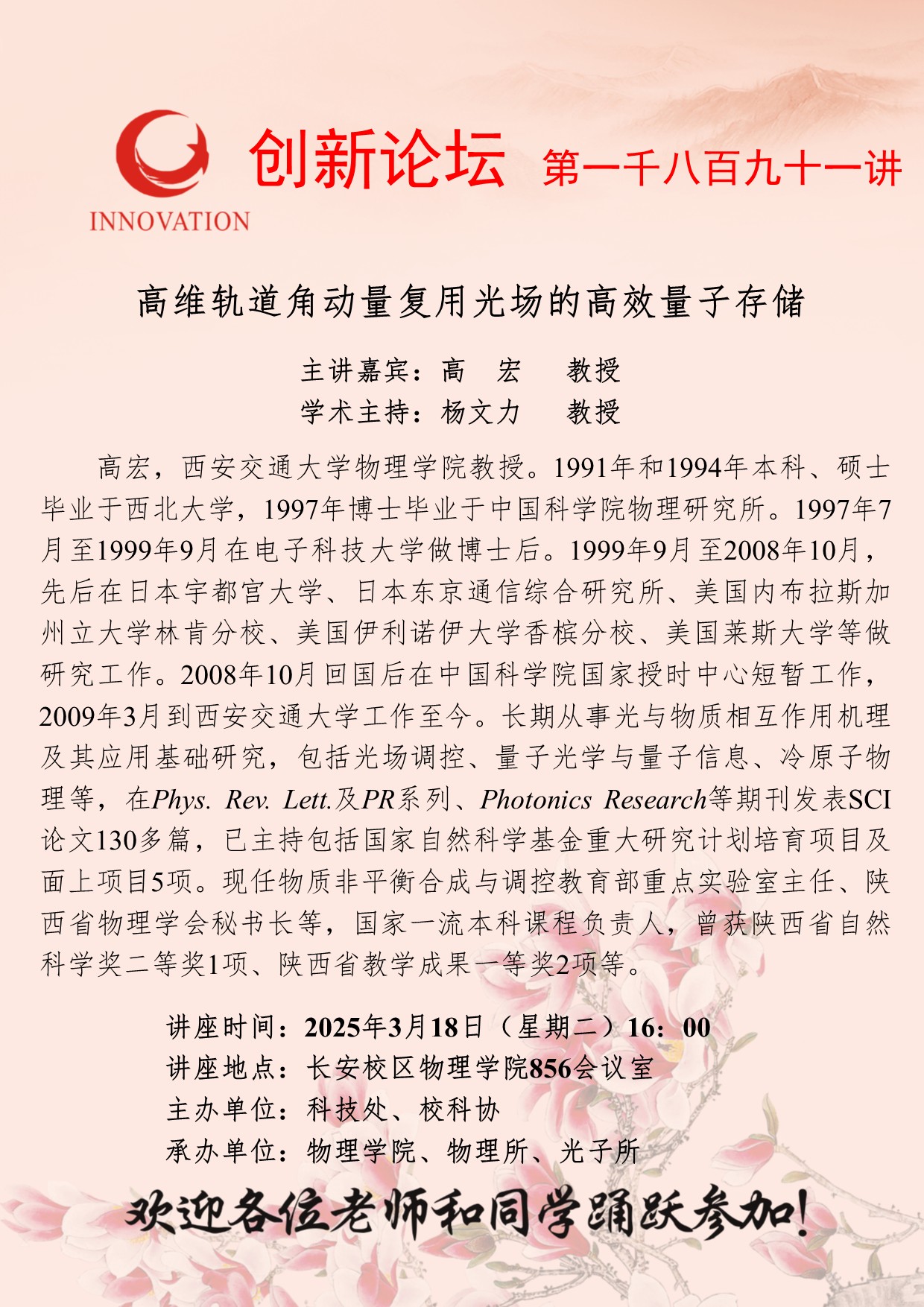 高宏 教授 bat365正版唯一官网创新论坛第一千八百九十一讲:高维轨道角动量复用光场的高效量子存储 讲座时间 2025年3月18日(星期二)16:00 讲座地点 长安校区物理学院856会议室 讲座人介绍 高宏 教授 讲座内容