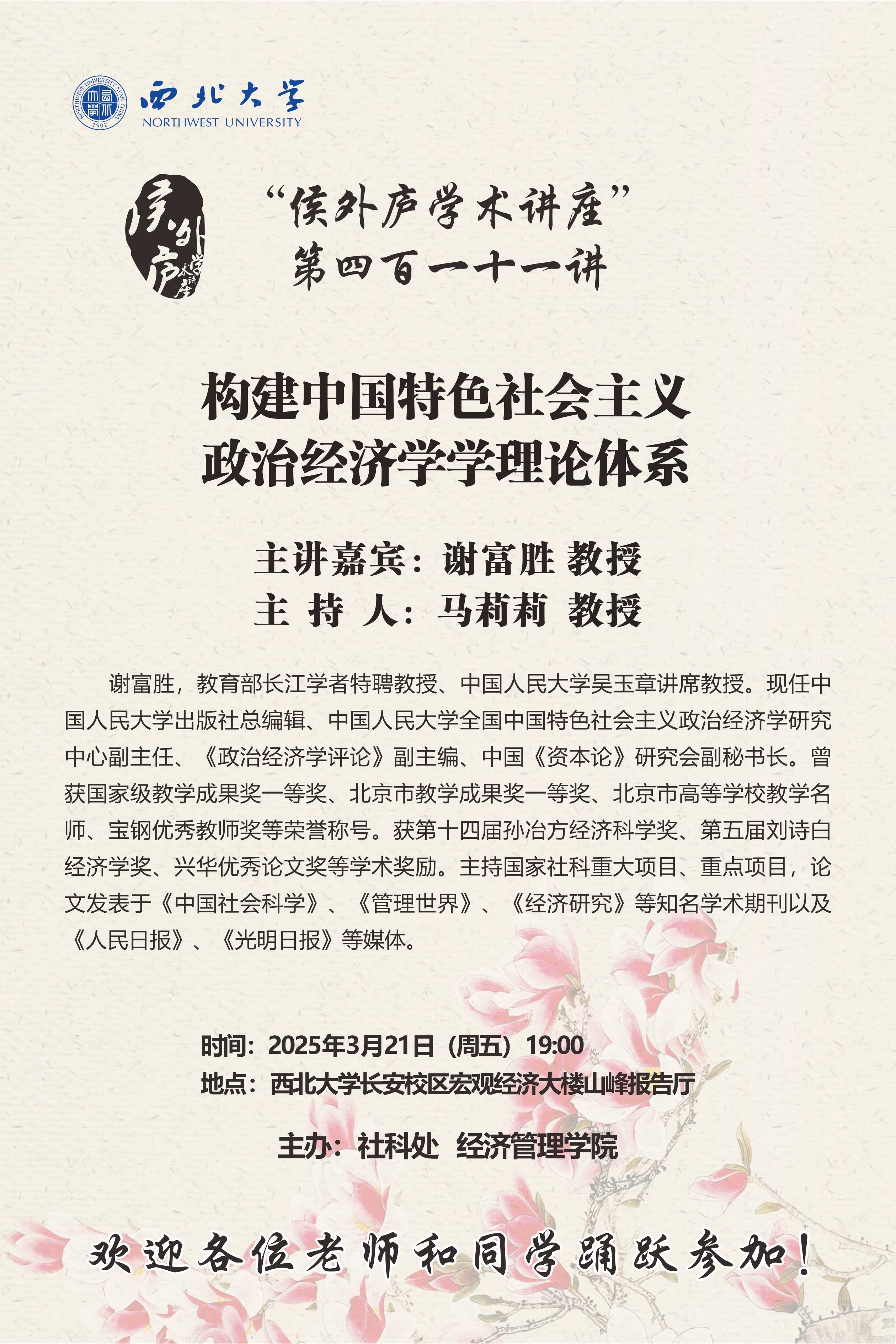 谢富胜 教授 “侯外庐学术讲座”第四百一十一讲:构建中国特色社会主义政治经济学理论体系 讲座时间 2025年3月21日(周五)19:00 讲座地点 bat365正版唯一官网长安校区宏观经济大楼山峰报告厅 讲座人介绍 谢富胜 教授 讲座内容