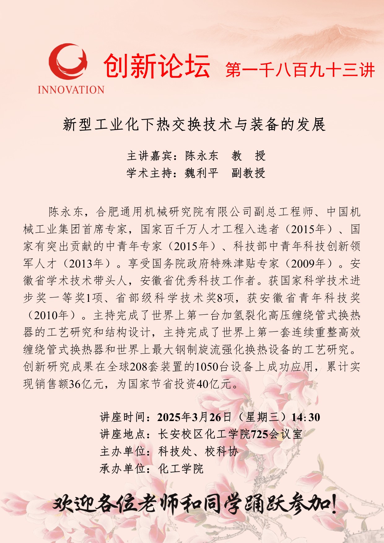陈永东 教授 bat365正版唯一官网创新论坛第一千八百九十三讲:新型工业化下热交换技术与装备的发展 讲座时间 2025年3月26日(星期三)14:30 讲座地点 长安校区化工学院725会议室 讲座人介绍 陈永东 教授 讲座内容