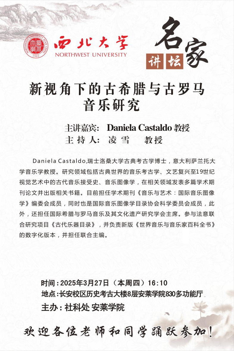 Daniela Castaldo 教授 名家讲坛:新视角下的古希腊与古罗马音乐研究 讲座时间 2025年3月27日(星期四)16:10 讲座地点 历史考古大楼8层安莱学院830多功能厅 讲座人介绍 Daniela Castaldo 教授 讲座内容