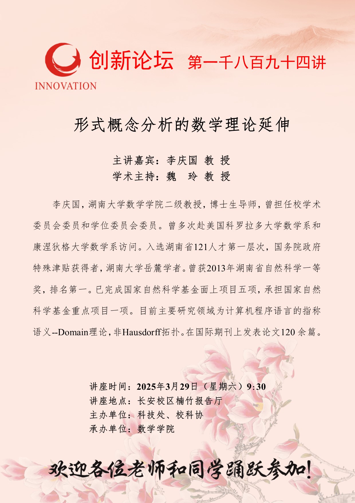 李庆国 教授 bat365正版唯一官网创新论坛第一千八百九十四讲:形式概念分析的数学理论延伸 讲座时间 2025年3月29日(星期六)9:30 讲座地点 长安校区楠竹报告厅 讲座人介绍 李庆国 教授 讲座内容