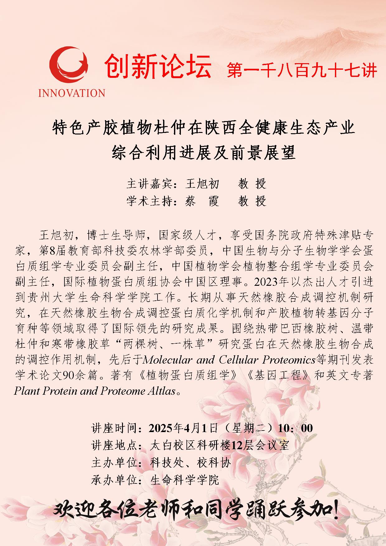 王旭初 教授 bat365正版唯一官网创新论坛第一千八百九十七讲:特色产胶植物杜仲在陕西全健康生态产业综合利用进展及前景展望 讲座时间 2025年4月1日(星期二)10:00 讲座地点 太白校区科研楼12层会议室 讲座人介绍 王旭初 教授 讲座内容
