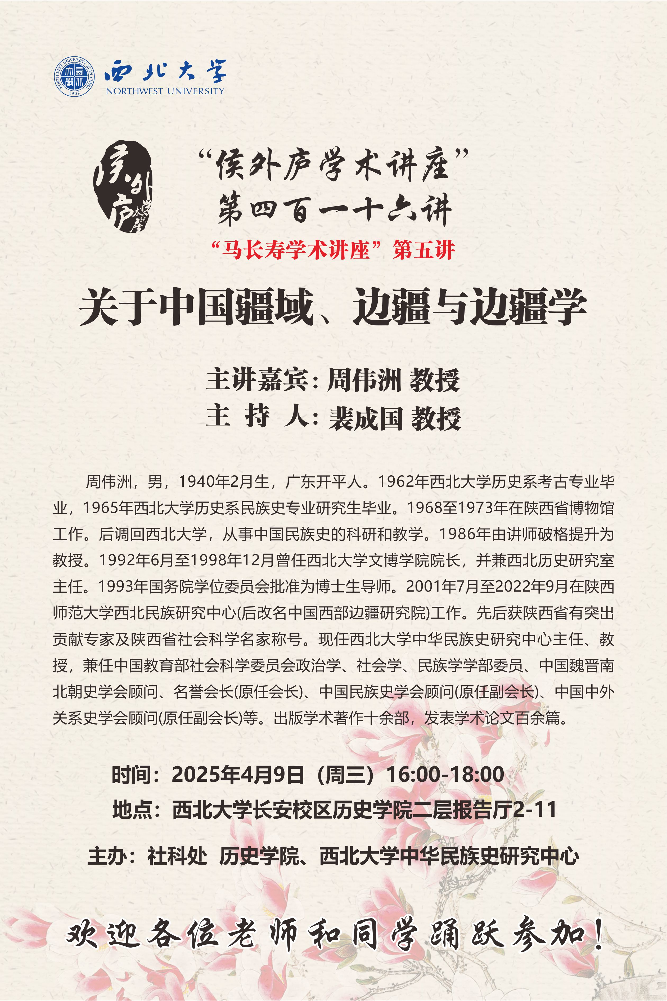周伟洲 教授 “侯外庐学术讲座”第四百一十六讲:关于中国疆域、边疆与边疆学 讲座时间 2025年4月9日(周三)16:00-18:00 讲座地点 bat365正版唯一官网长安校区历史学院二层报告厅2-11 讲座人介绍 周伟洲 教授 讲座内容