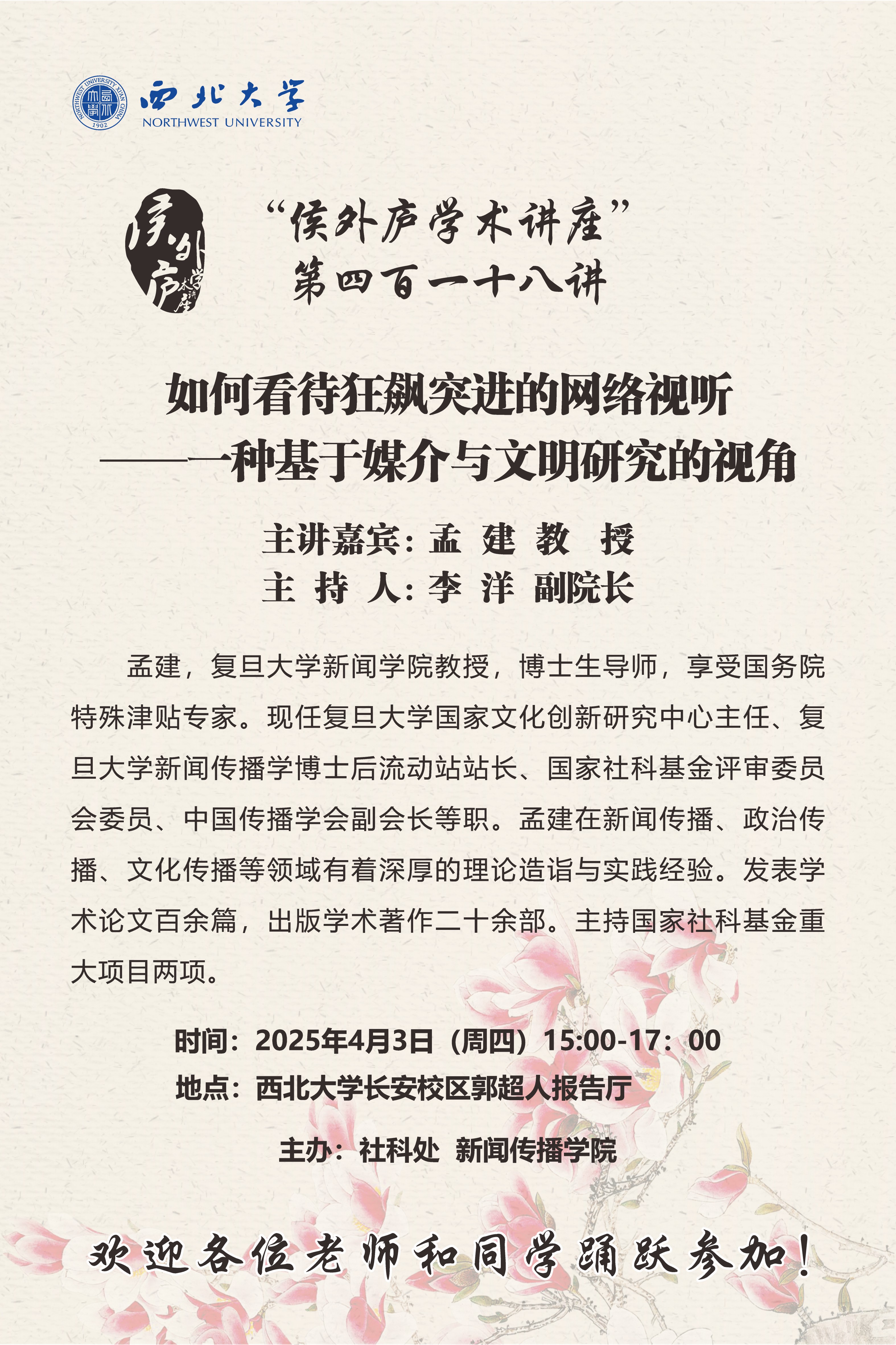 孟建 教授 “侯外庐学术讲座”第四百一十八讲:如何看待狂飙突进的网络视听——一种基于媒介与文明研究的视角 讲座时间 2025年4月3日(周四)15:00-17:00 讲座地点 bat365正版唯一官网长安校区郭超人报告厅 讲座人介绍 孟建 教授 讲座内容