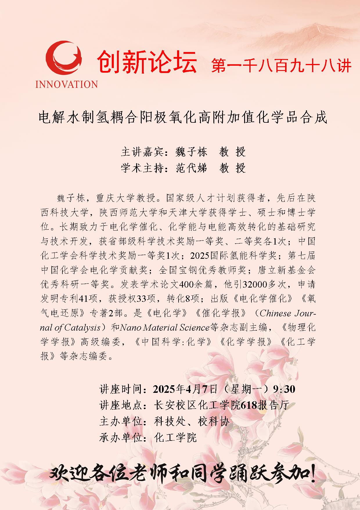 魏子栋 教授 bat365正版唯一官网创新论坛第一千八百九十八讲:电解水制氢耦合阳极氧化高附加值化学品合成 讲座时间 2025年4月7日(星期一)9:30 讲座地点 长安校区化工学院618报告厅 讲座人介绍 魏子栋 教授 讲座内容