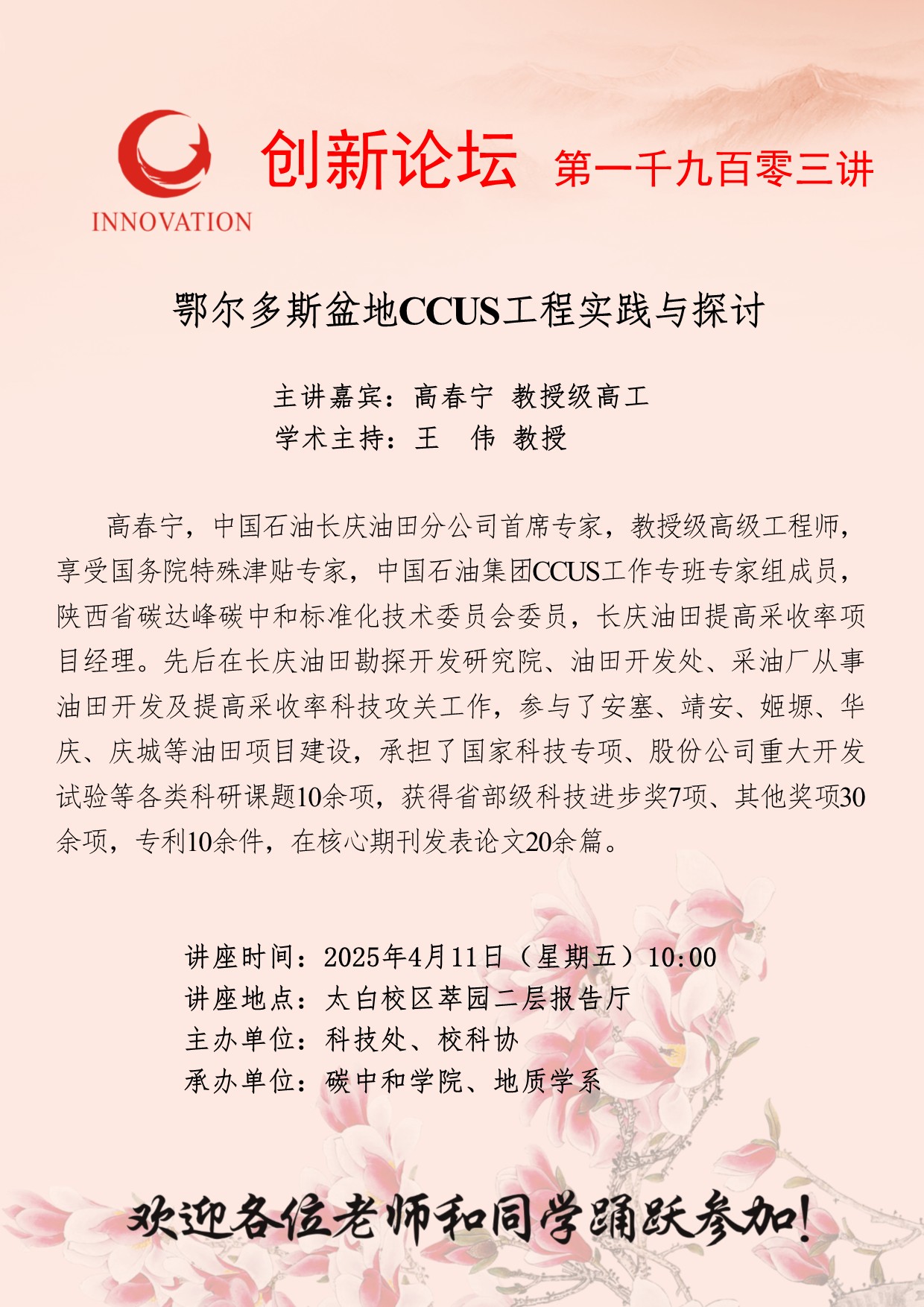 高春宁 教授级高工 bat365正版唯一官网创新论坛第一千九百零三讲:鄂尔多斯盆地CCUS工程实践与探讨 讲座时间 2025年4月11日(星期五)10:00 讲座地点 太白校区萃园二层报告厅 讲座人介绍 高春宁 教授级高工 讲座内容
