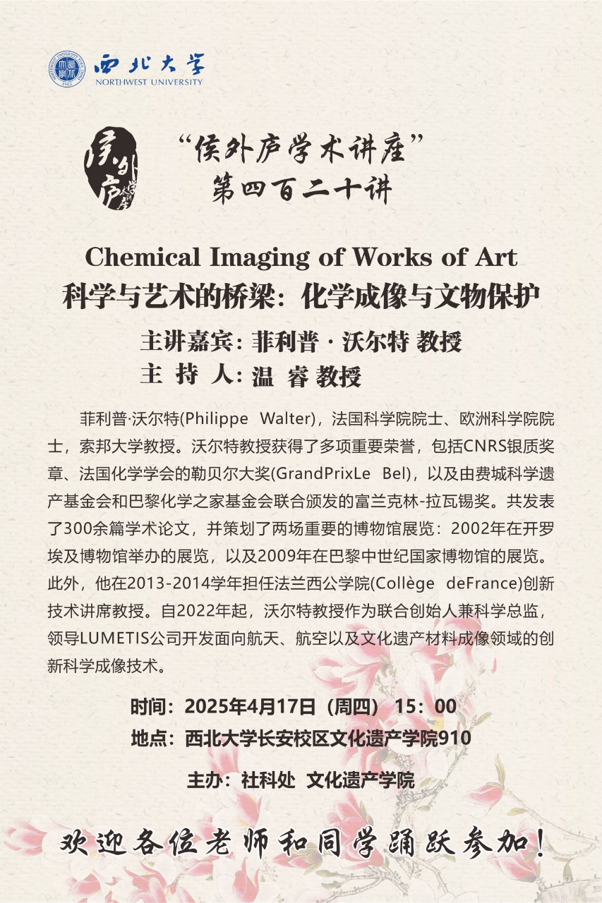 菲利普·沃尔特 教授 “侯外庐学术讲座”第四百二十讲:Chemical Imaging of Works of Art科学与艺术的桥梁:化学成像与文物保护 讲座时间 2025年4月17日(周四)15:00 讲座地点 bat365正版唯一官网长安校区文化遗产学院910 讲座人介绍 菲利普·沃尔特 教授 讲座内容