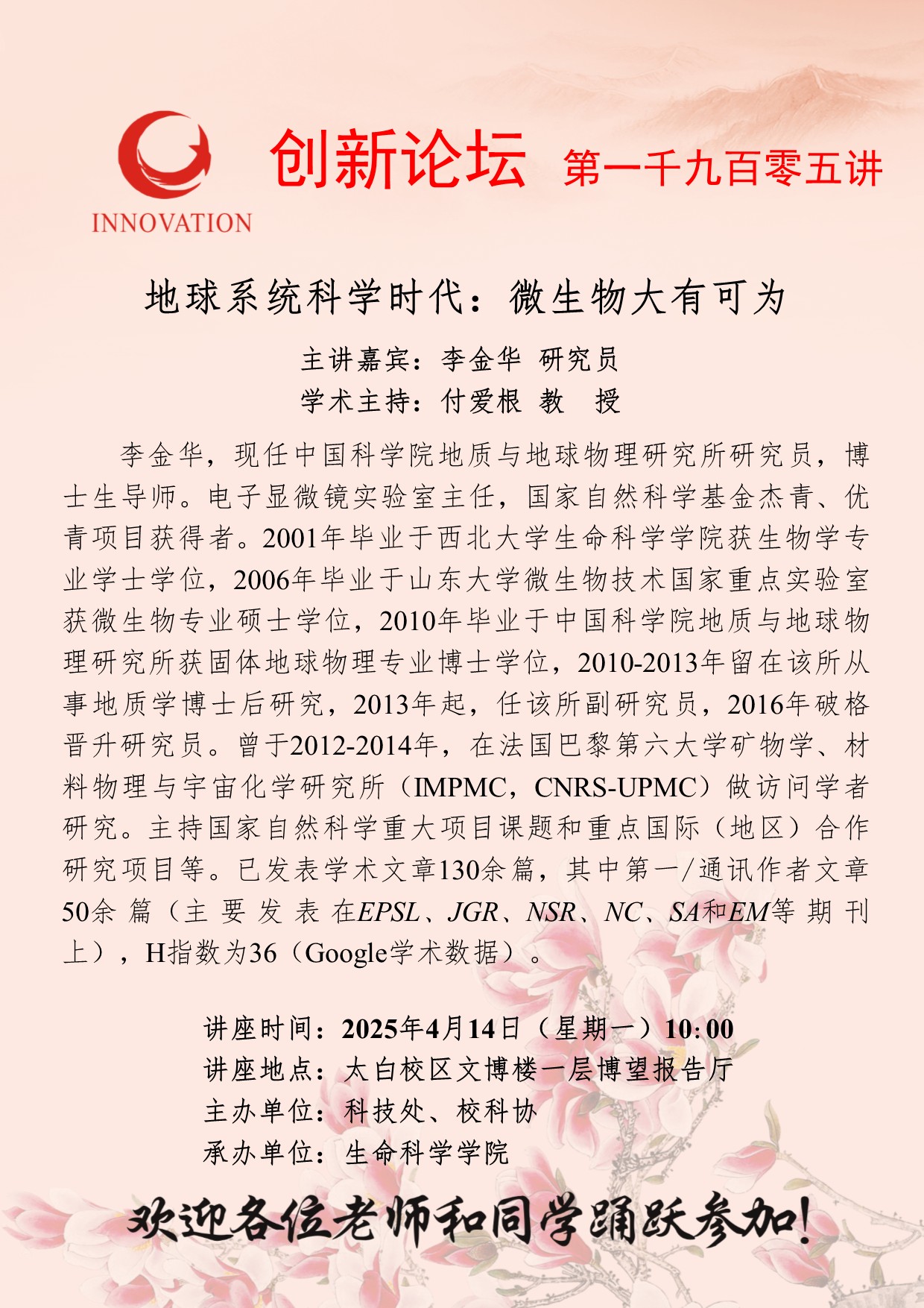 李金华 研究员 bat365正版唯一官网创新论坛第一千九百零五讲:地球系统科学时代:微生物大有可为 讲座时间 2025年4月14日(星期一)10:00 讲座地点 太白校区文博楼一层博望报告厅 讲座人介绍 李金华 研究员 讲座内容