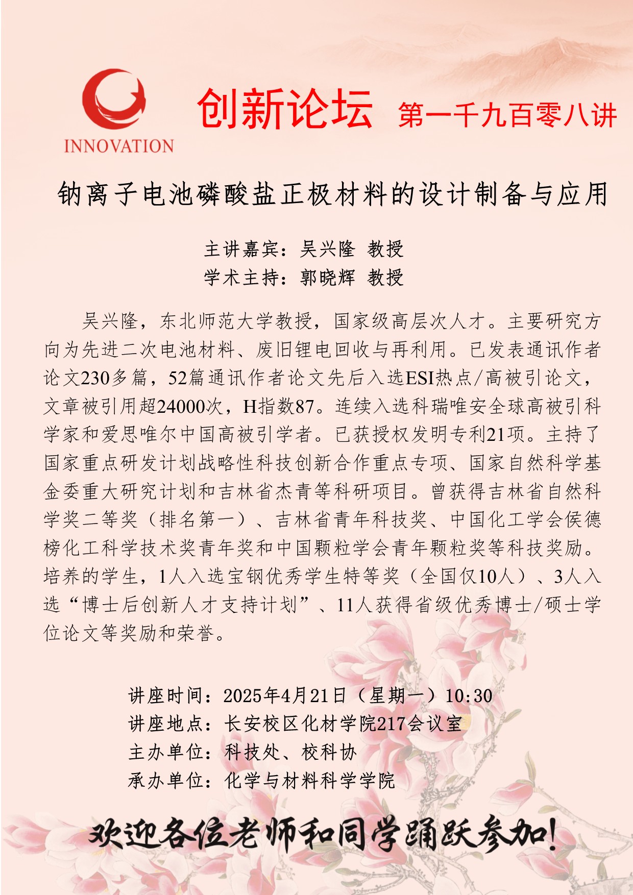 吴兴隆 教授 bat365正版唯一官网创新论坛第一千九百零八讲:钠离子电池磷酸盐正极材料的设计制备与应用 讲座时间 2025年4月21日(星期一)10:30 讲座地点 长安校区化材学院217会议室 讲座人介绍 吴兴隆 教授 讲座内容