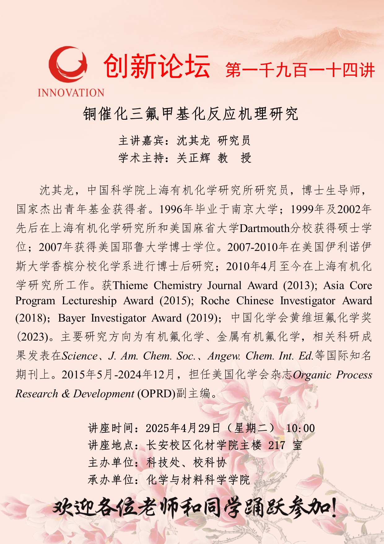 沈其龙 研究员 bat365正版唯一官网创新论坛第一千九百一十四讲:铜催化三氟甲基化反应机理研究 讲座时间 2025年4月29日(星期二) 10:00 讲座地点 长安校区化材学院主楼 217 室 讲座人介绍 沈其龙 研究员 讲座内容