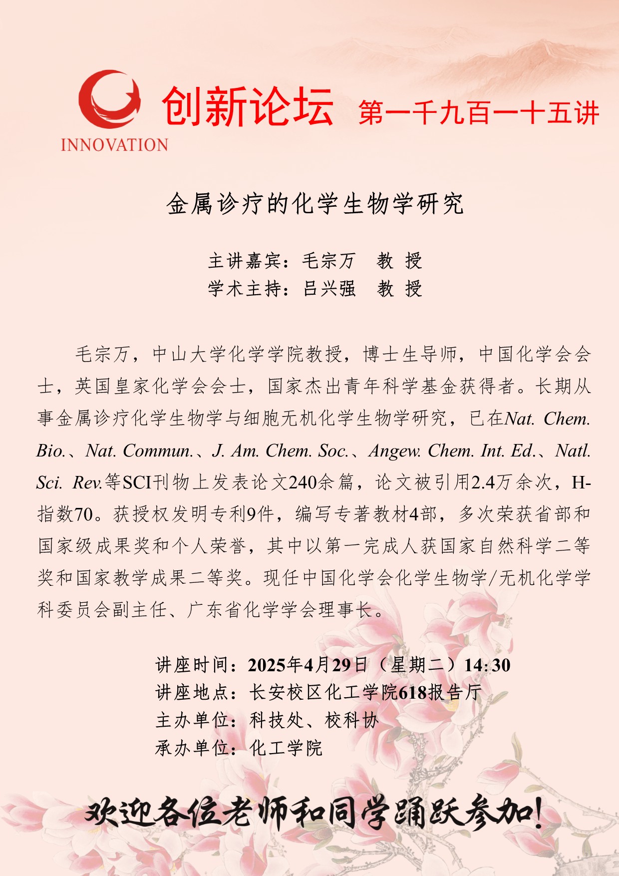毛宗万 教授 bat365正版唯一官网创新论坛第一千九百一十五讲:金属诊疗的化学生物学研究 讲座时间 2025年4月29日(星期二)14:30 讲座地点 长安校区化工学院618报告厅 讲座人介绍 毛宗万 教授 讲座内容