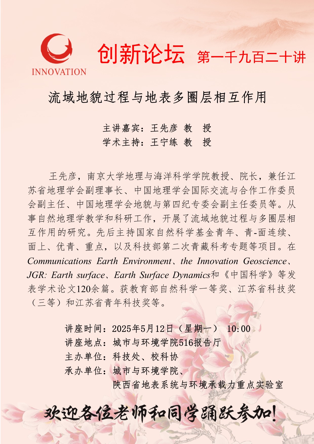 王先彦 教授 bat365正版唯一官网创新论坛第一千九百二十讲:流域地貌过程与地表多圈层相互作用 讲座时间 2025年5月12日(星期一) 10:00 讲座地点 城市与环境学院516报告厅 讲座人介绍 王先彦 教授 讲座内容